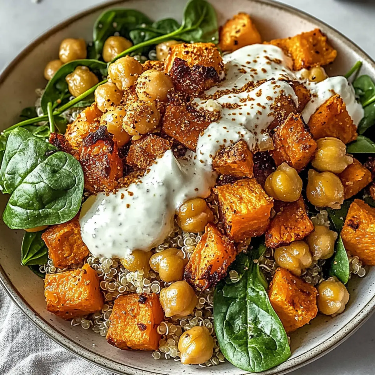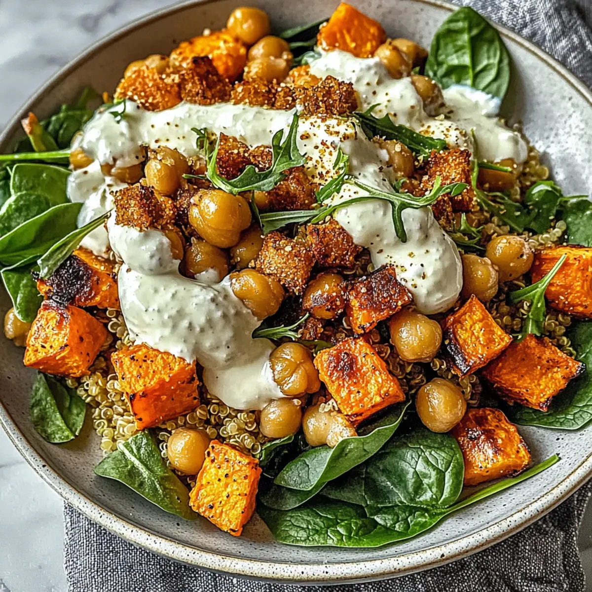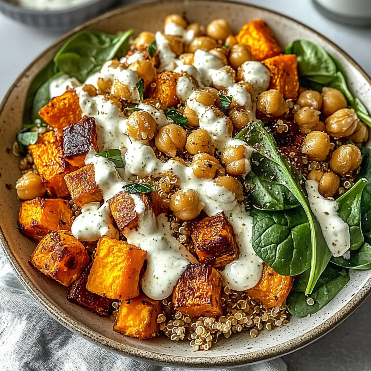 - Assemble bowls with quinoa, sweet potatoes, chickpeas, spinach, and avocado. Drizzle with tahini sauce.