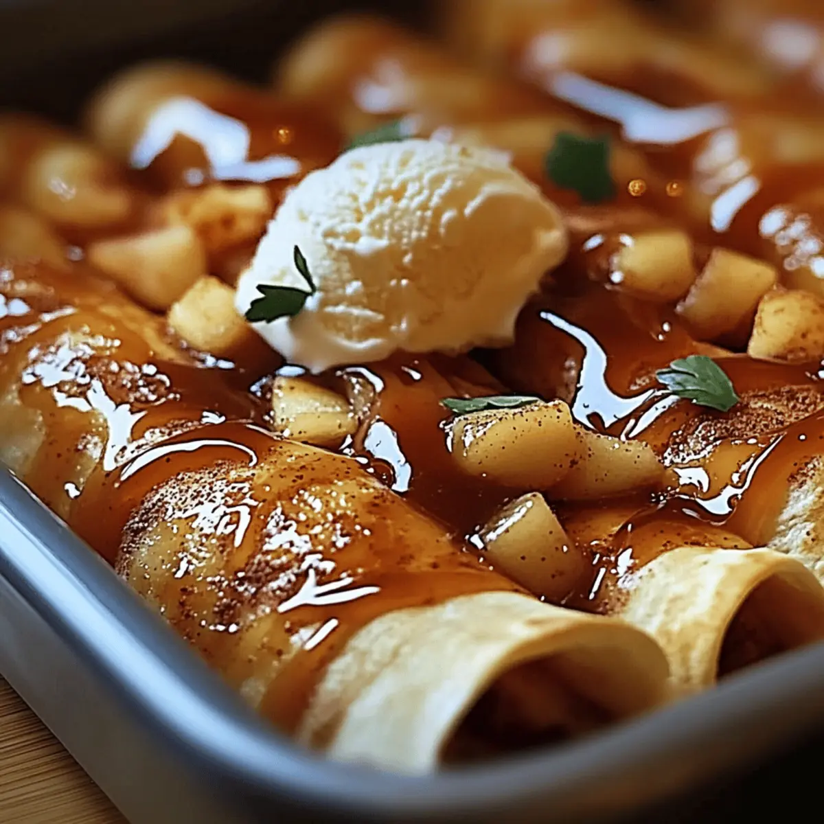 Once baked, remove the dish from the oven and let the enchiladas cool for a few minutes. Serve warm, drizzling generously with caramel sauce and adding a scoop of vanilla ice cream on the side for an irresistible finishing touch. Enjoy the cozy flavors of your homemade Apple Pie Enchiladas Dessert!