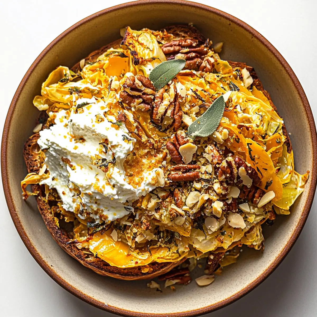 To serve, pile generous portions of the cabbage salad onto toasted sourdough bread. Top each serving with creamy ricotta, followed by a sprinkle of the reserved toasted pecans and pepitas, and the crispy garlic and sage. This Baked Cabbage Salad with Winter Romesco is now ready to warm your soul!