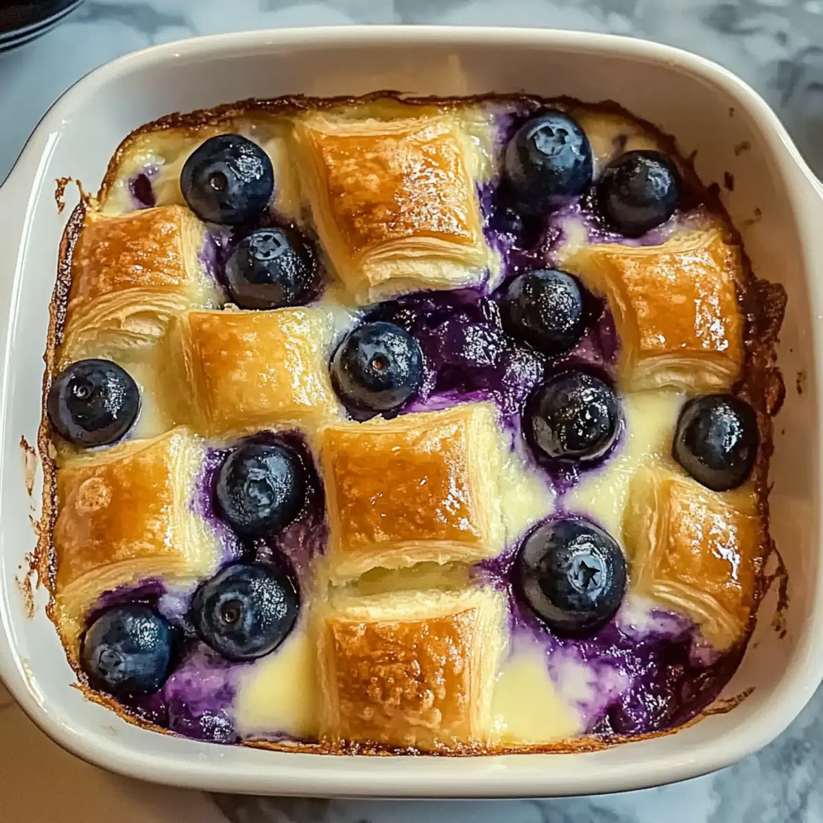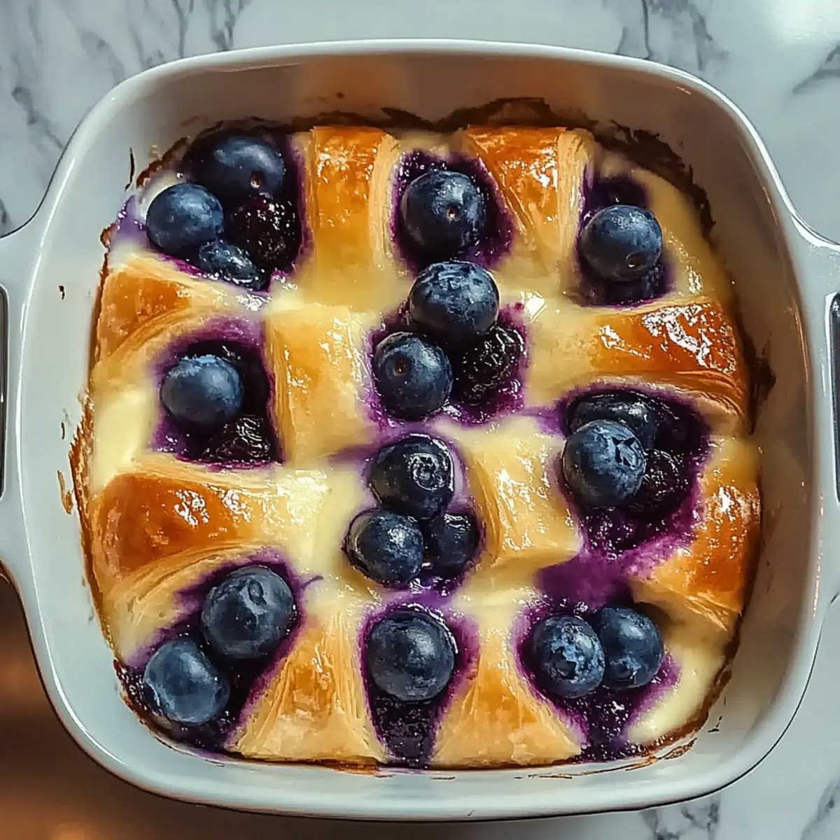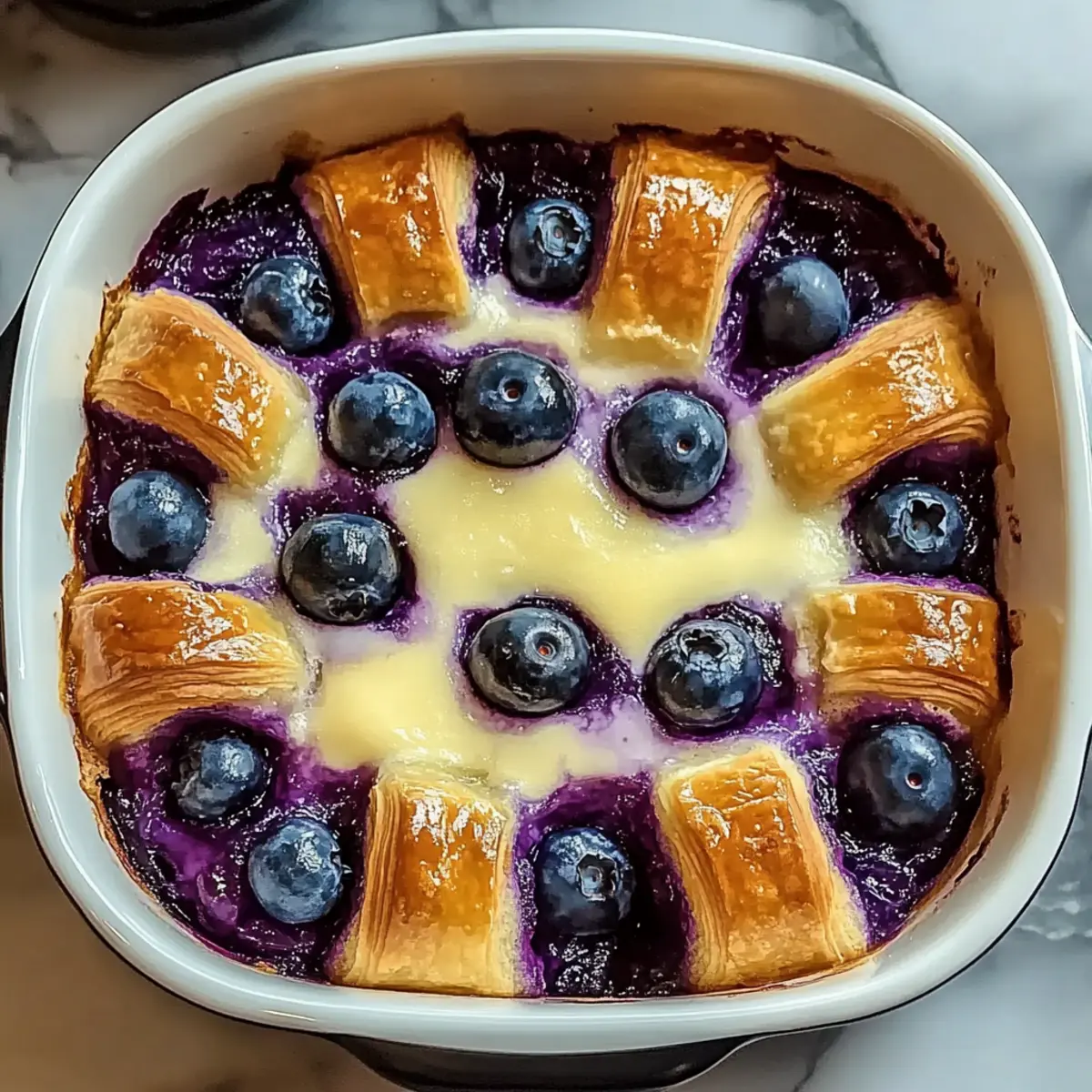 - Layer Ingredients: Pour custard over croissants, dollop cream cheese, and scatter blueberries on top.