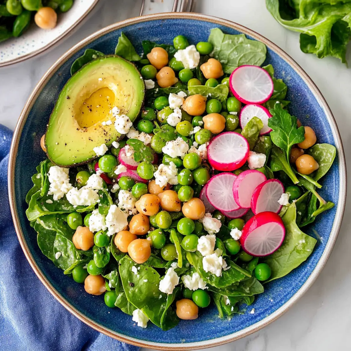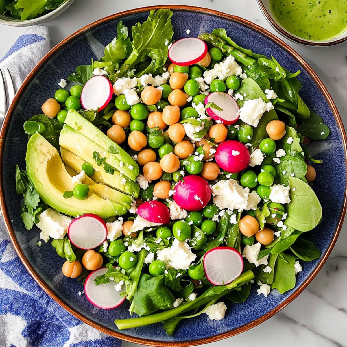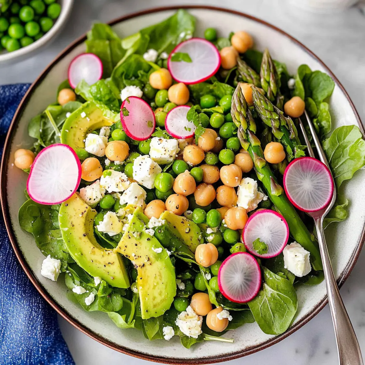 On a large platter, arrange a bed of salad greens, creating an inviting base for your bright spring salad. Layer the asparagus and peas mixture on top, followed by thinly sliced radishes, crumbled feta, diced avocado, toasted pistachios, and roasted chickpeas. This vibrant assembly showcases the colors and textures of spring.