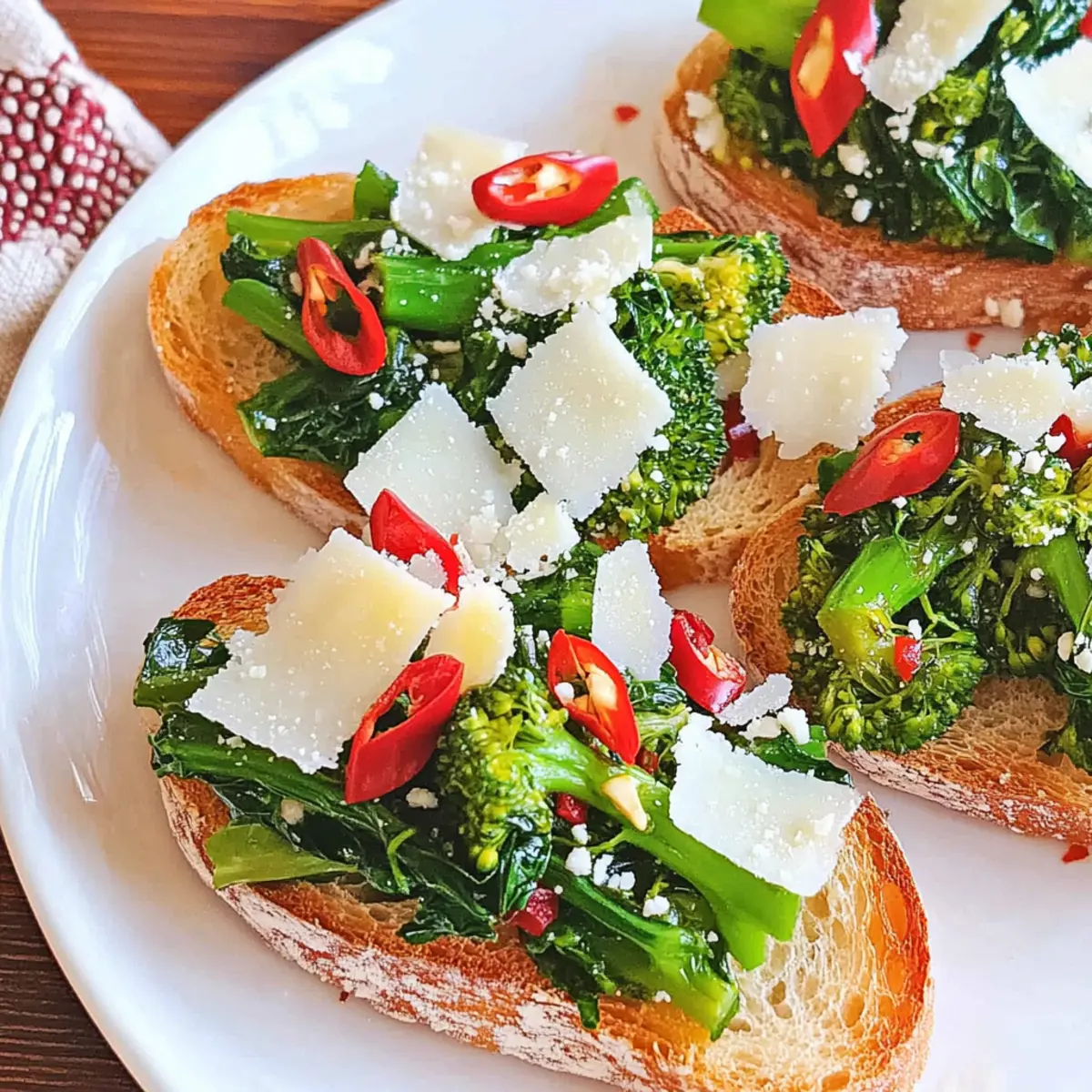 If you have leftovers, it’s best to store the broccoli rabe mixture in an airtight container in the fridge for up to 3 days. To maintain the crispness of the tartines, keep the toasted baguette slices separate. This way, when you’re ready to enjoy the leftovers, simply re-toast the bread in the oven to regain that delightful crunch!