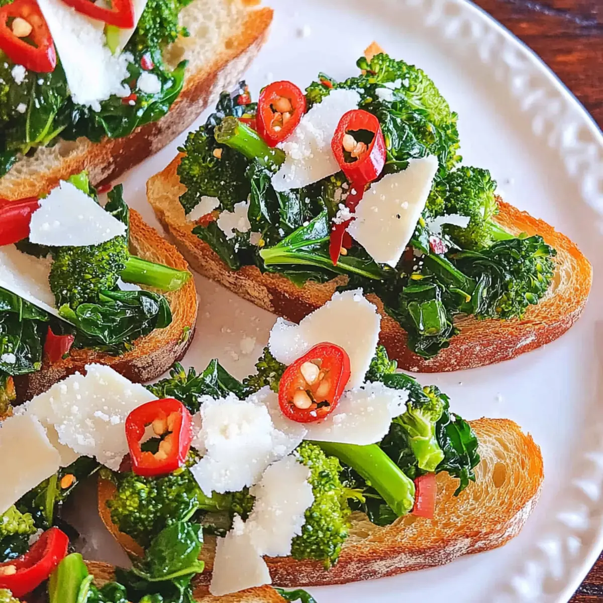 Present the completed Broccoli Rabe Tartines on a decorative platter, ready to impress your guests. A drizzle of extra olive oil on top can add a finishing touch. These two-bite appetizers are best enjoyed fresh, allowing everyone to appreciate the crunchy texture and vibrant flavors!