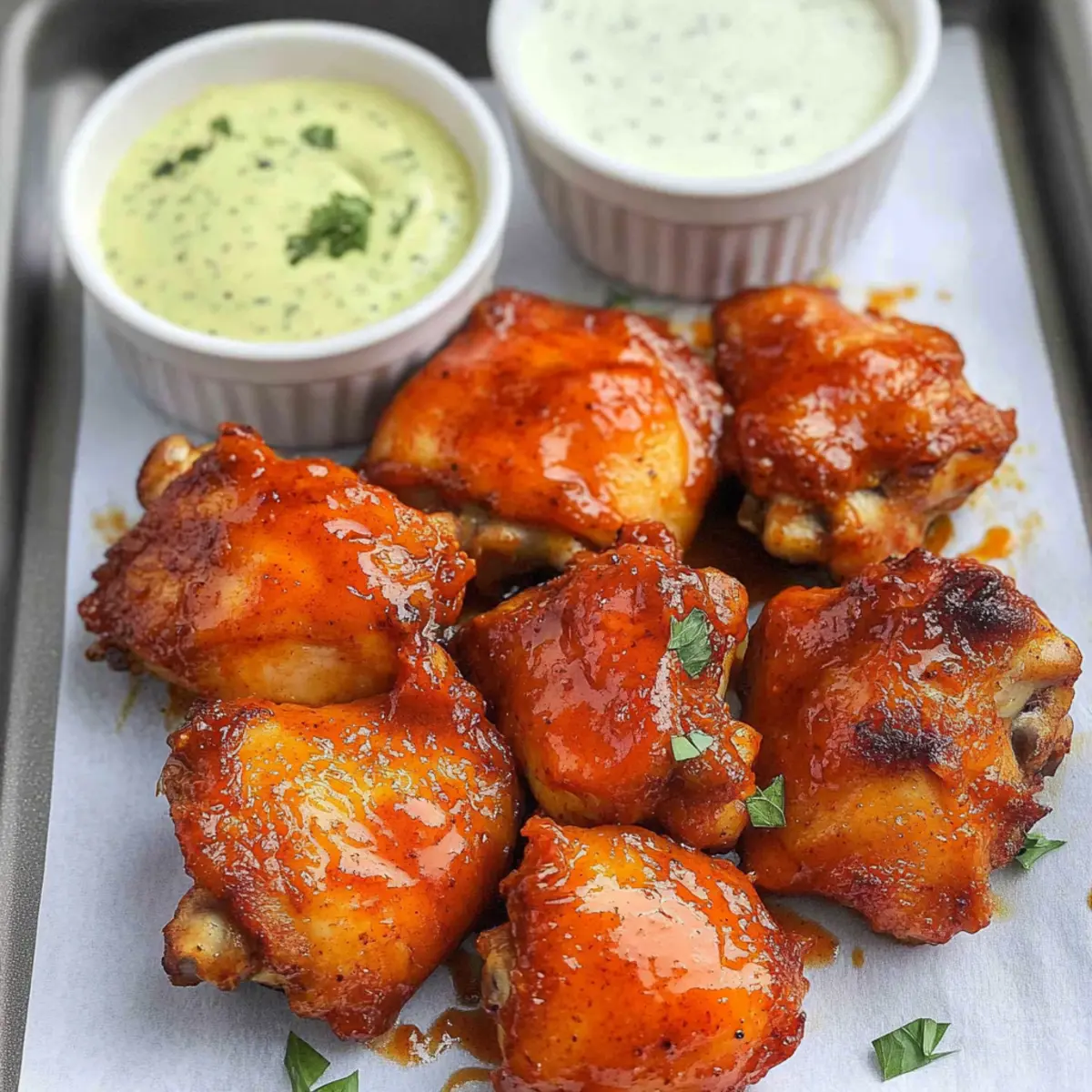 Serve these thighs with a creamy blue cheese or ranch dressing on the side. It’s the perfect cooling counterpart to the spicy heat!