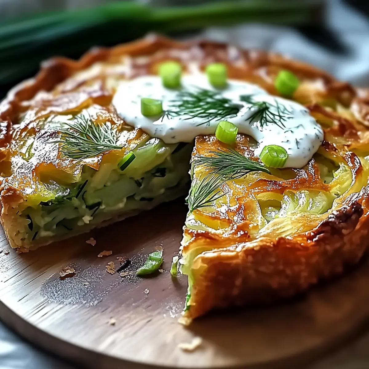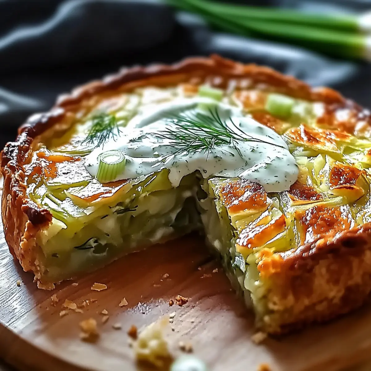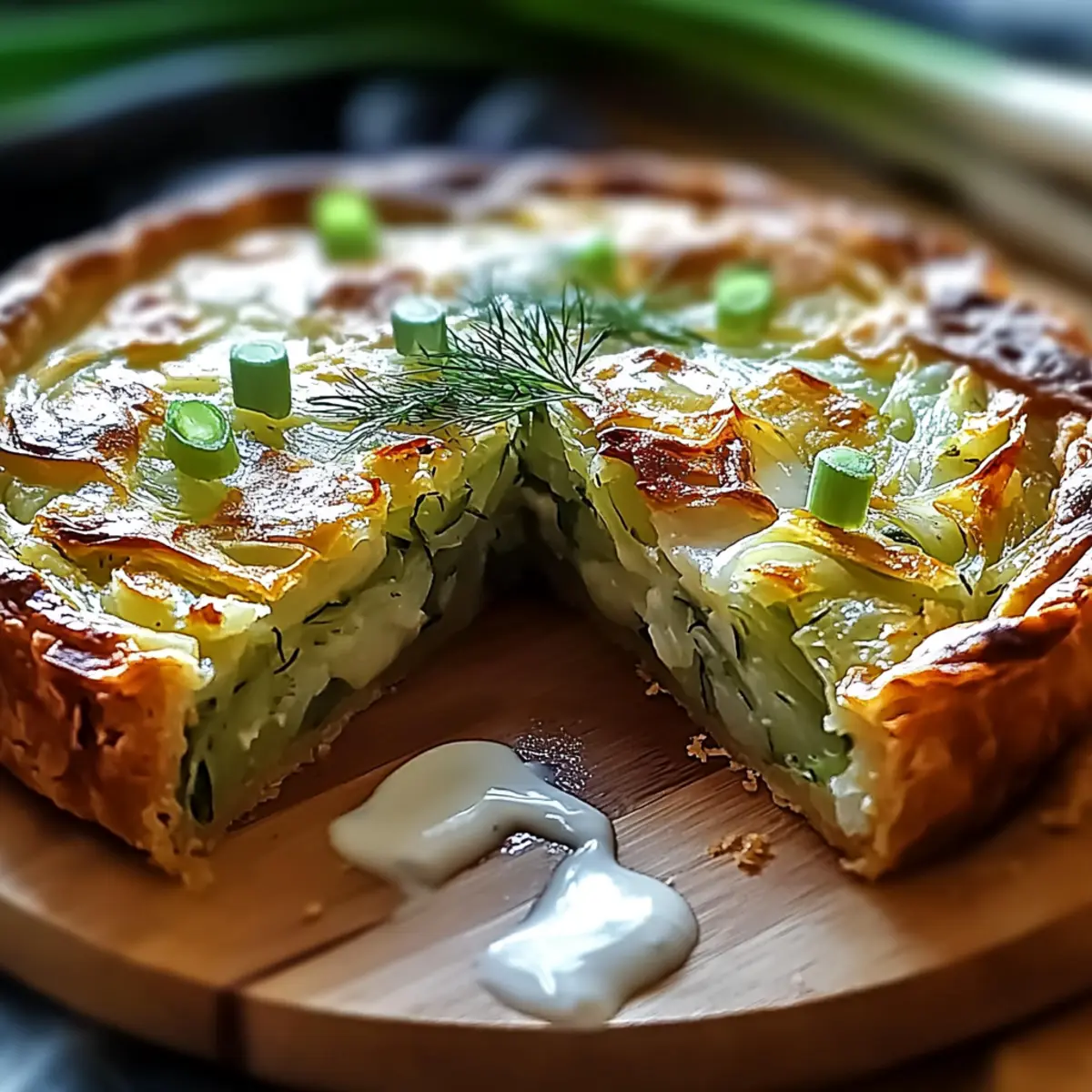 - Let the Cabbage Pie cool slightly, then garnish with chopped green onions or dill. Serve warm with the dill sauce.
