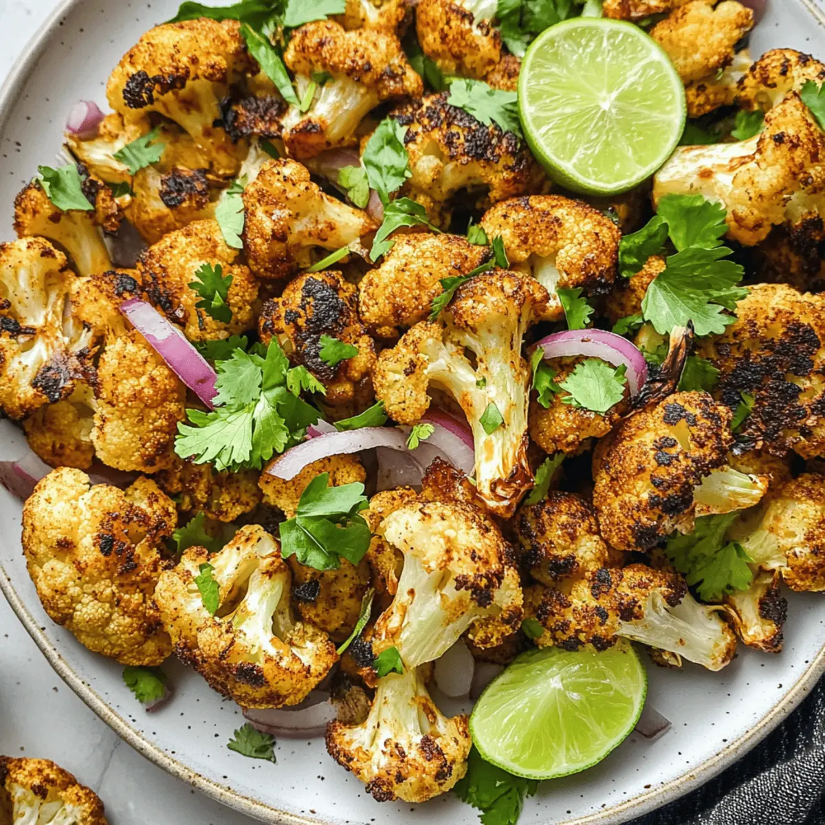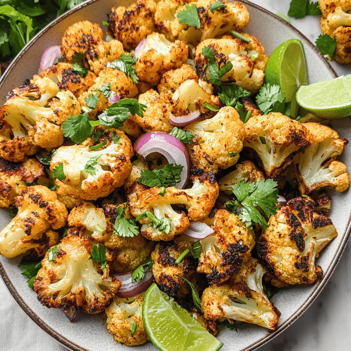 Once roasted, remove the caramelized Mexican roasted cauliflower from the oven. Immediately drizzle fresh lime juice over the top for a burst of zesty flavor. Finish off with freshly chopped cilantro and red onion, adding an intriguing contrast to the warm roasted florets. If desired, include sliced avocado for extra creaminess before serving.