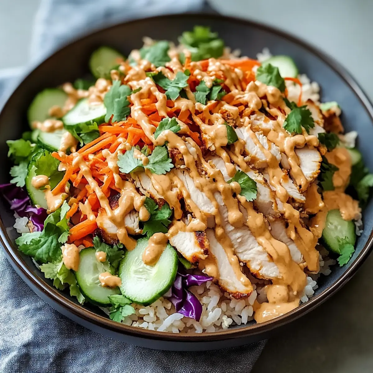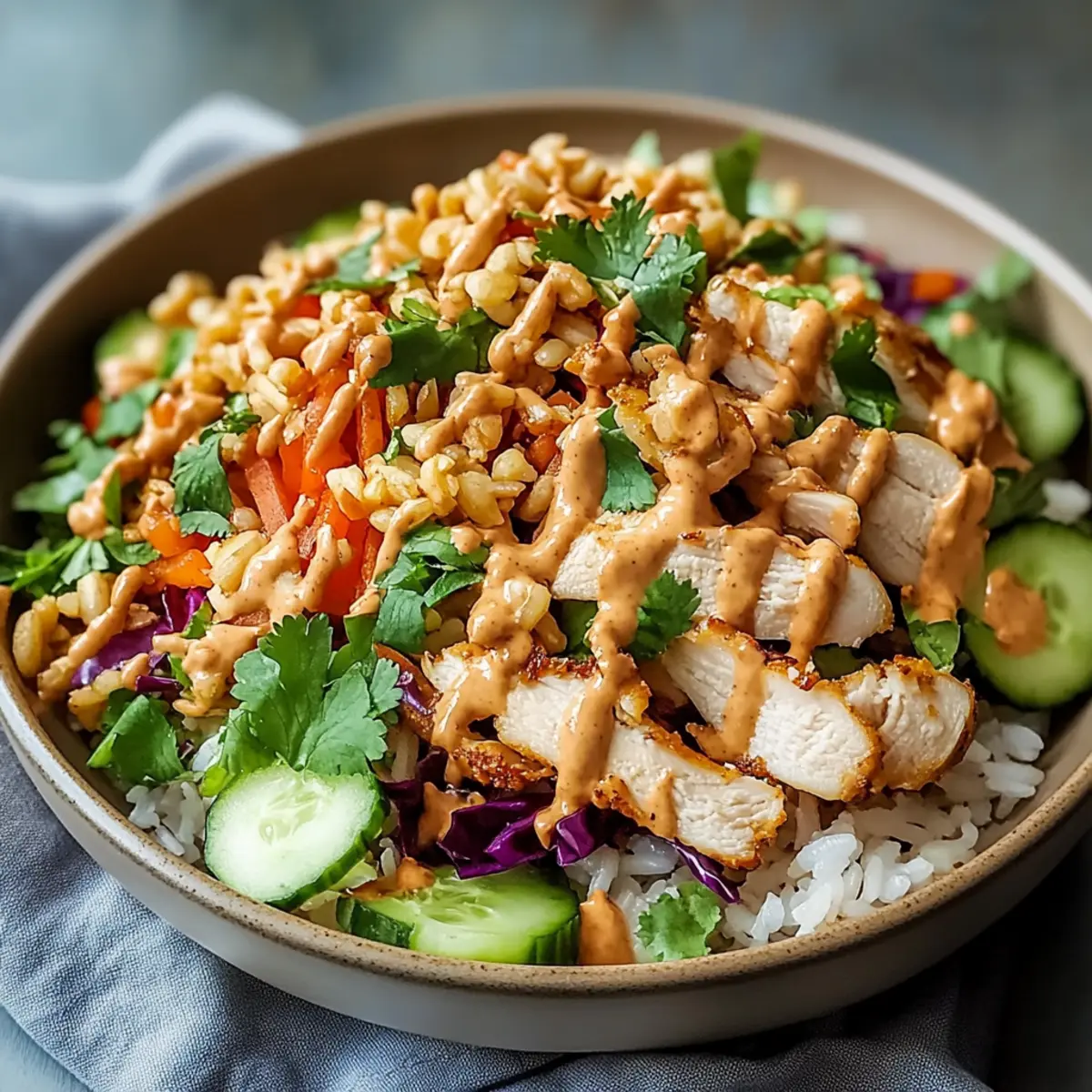 In a large mixing bowl, combine the crispy rice, cooked chicken, and your choice of fresh vegetables—julienned carrots, chopped red cabbage, diced cucumber, and sliced green onions. Add the fresh cilantro for a burst of flavor, and gently mix everything together for an even distribution of ingredients.