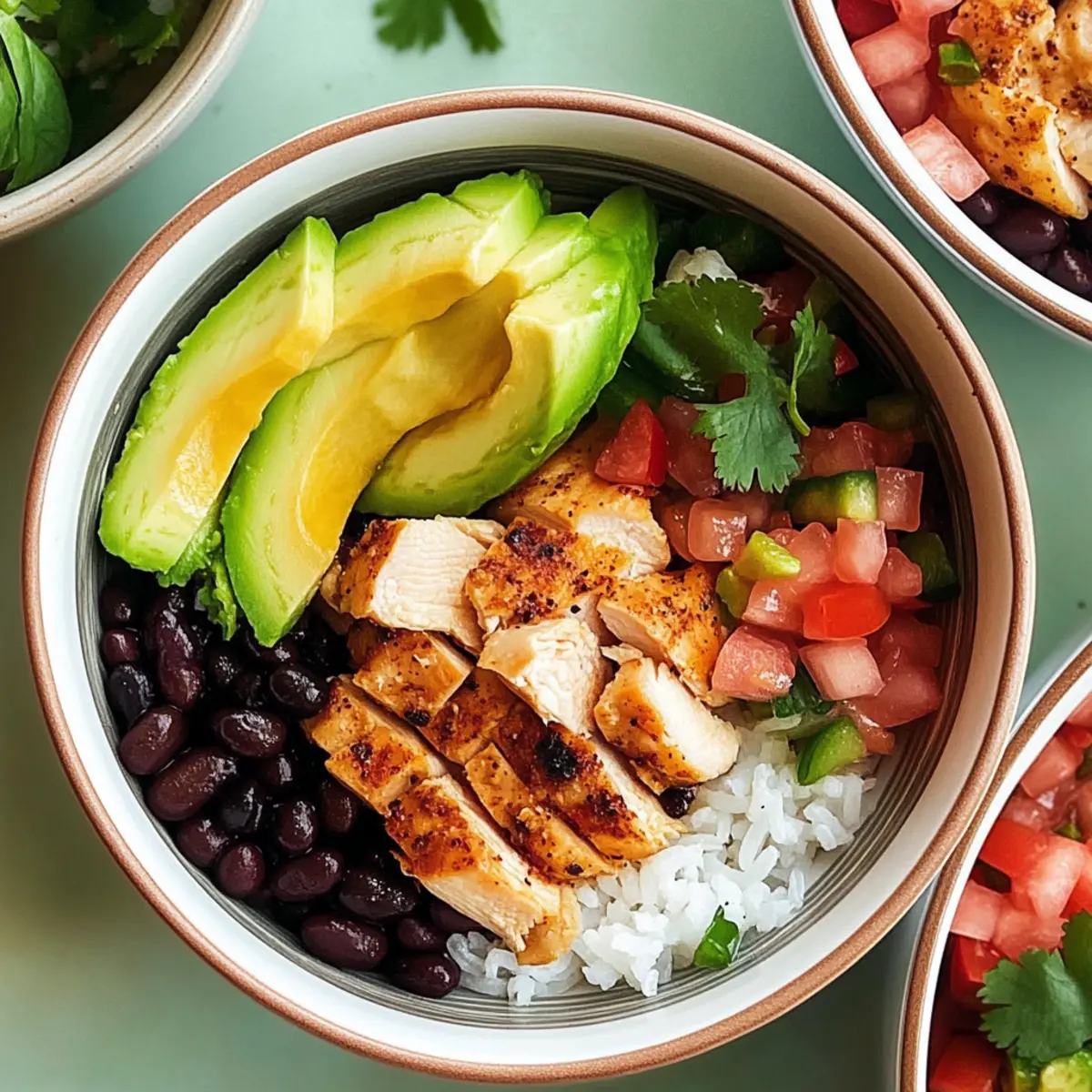 - Assemble the taco bowls by layering rice, beans, sliced chicken, pico de gallo, and avocado slices.