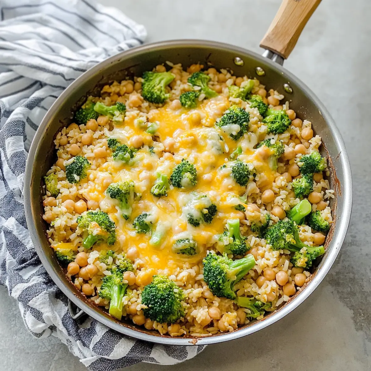 - After the rice has cooked, add 2 cups of broccoli florets and 1 can of drained chickpeas to the skillet. Cover and cook for another 5 minutes.