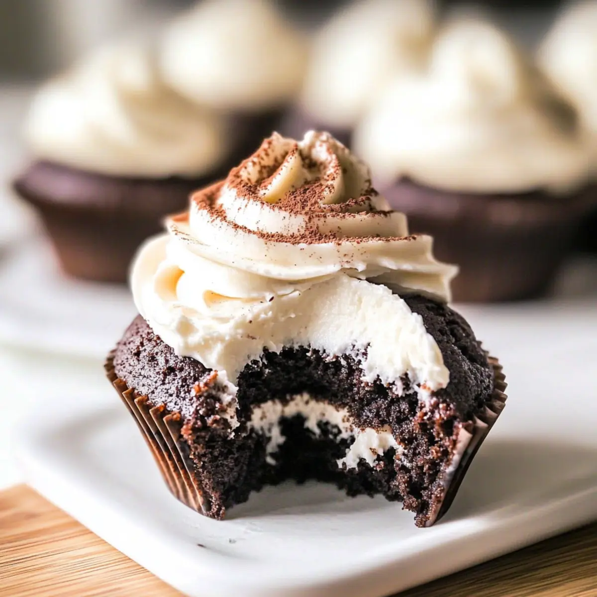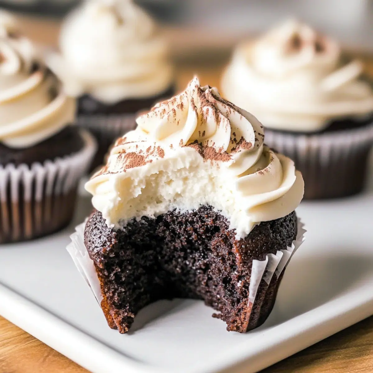 While the cupcakes cool, you can whip up your frosting! In a mixing bowl, combine 8 oz of softened less fat cream cheese, ¼ cup plain low-fat Greek yogurt, ⅓ cup monk fruit sweetener, and 1½ teaspoons of vanilla bean paste. Beat the mixture until it’s smooth and creamy, ensuring each ingredient blends beautifully to create a light, luscious frosting for your healthy chocolate cupcakes.