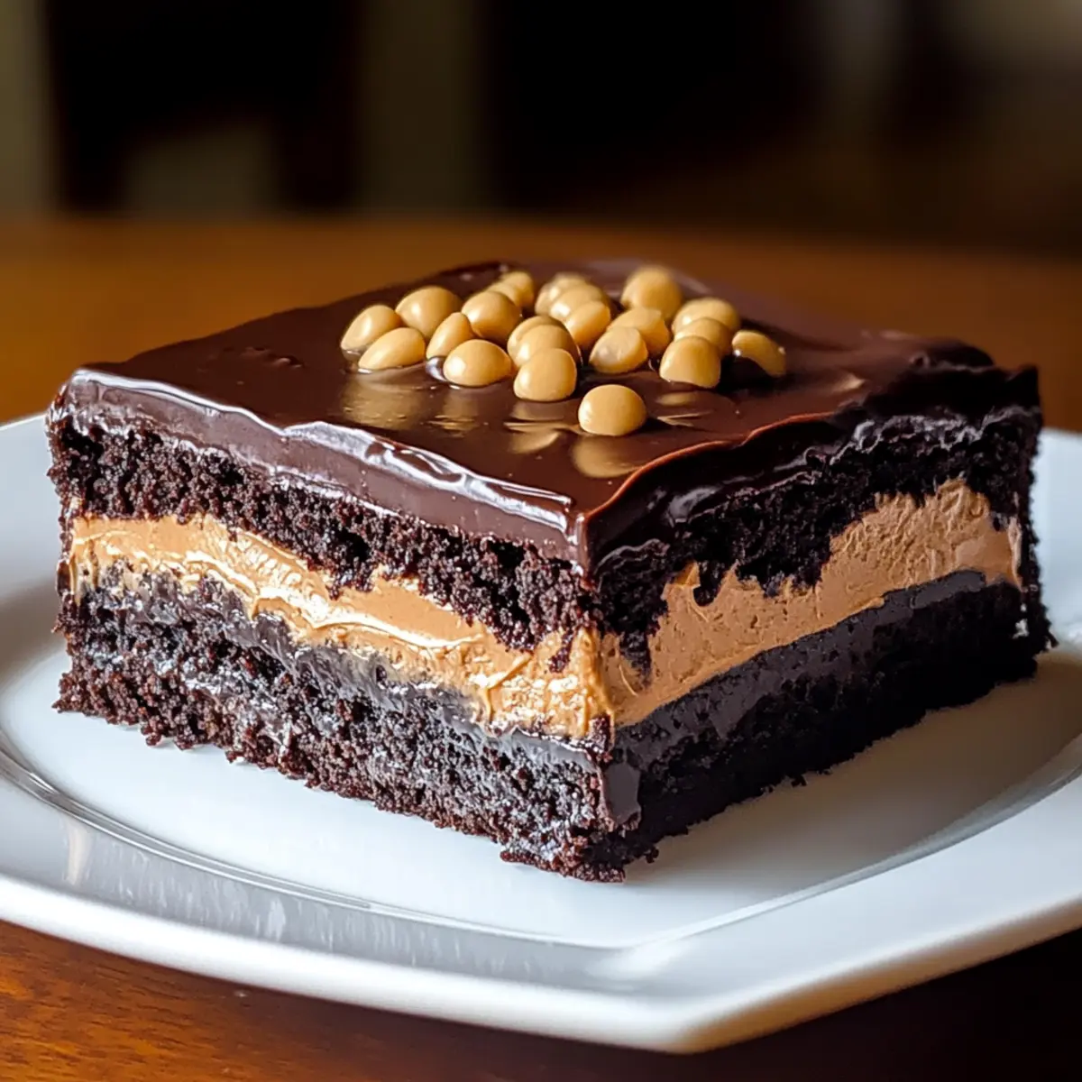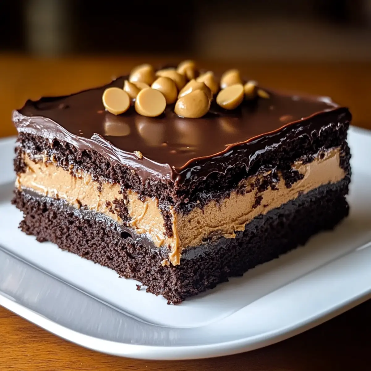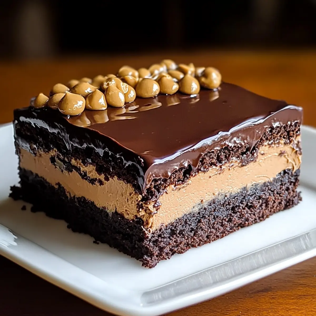 - Spread the peanut butter layer over the cooled cake, then pour the chocolate glaze on top, spreading evenly.