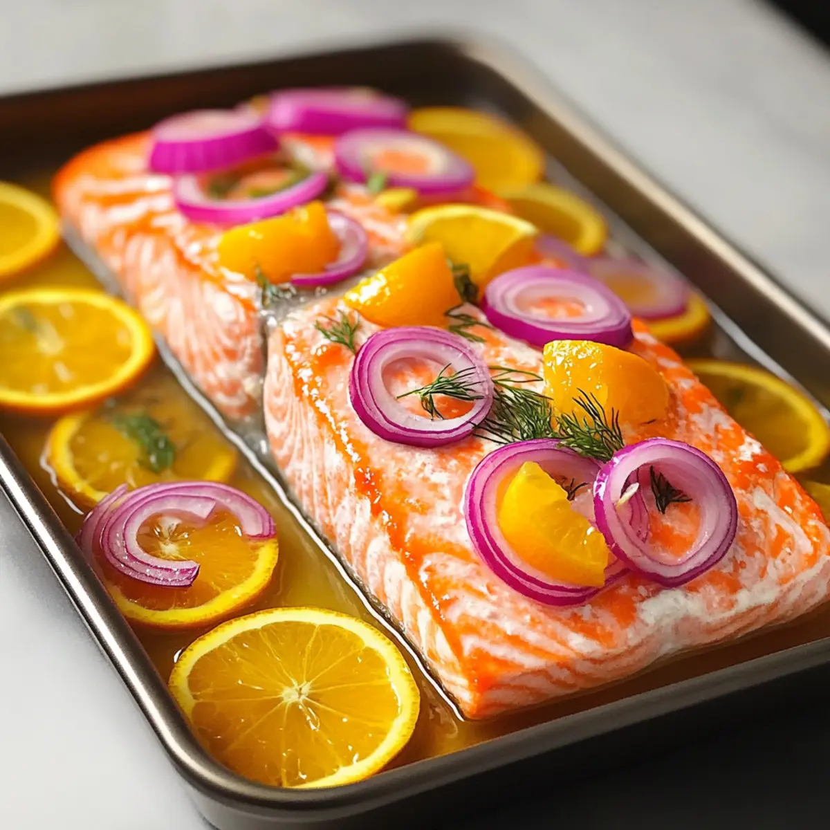 Pour the aromatic marinade generously over the salmon fillets on your baking sheet. Ensure that each piece is well-coated for maximum flavor infusion. As you do this, allow the marinade to settle into the fish, creating a lovely glaze that will caramelize while roasting, ensuring your Citrus Roasted Salmon will be full of bright, zesty flavor.