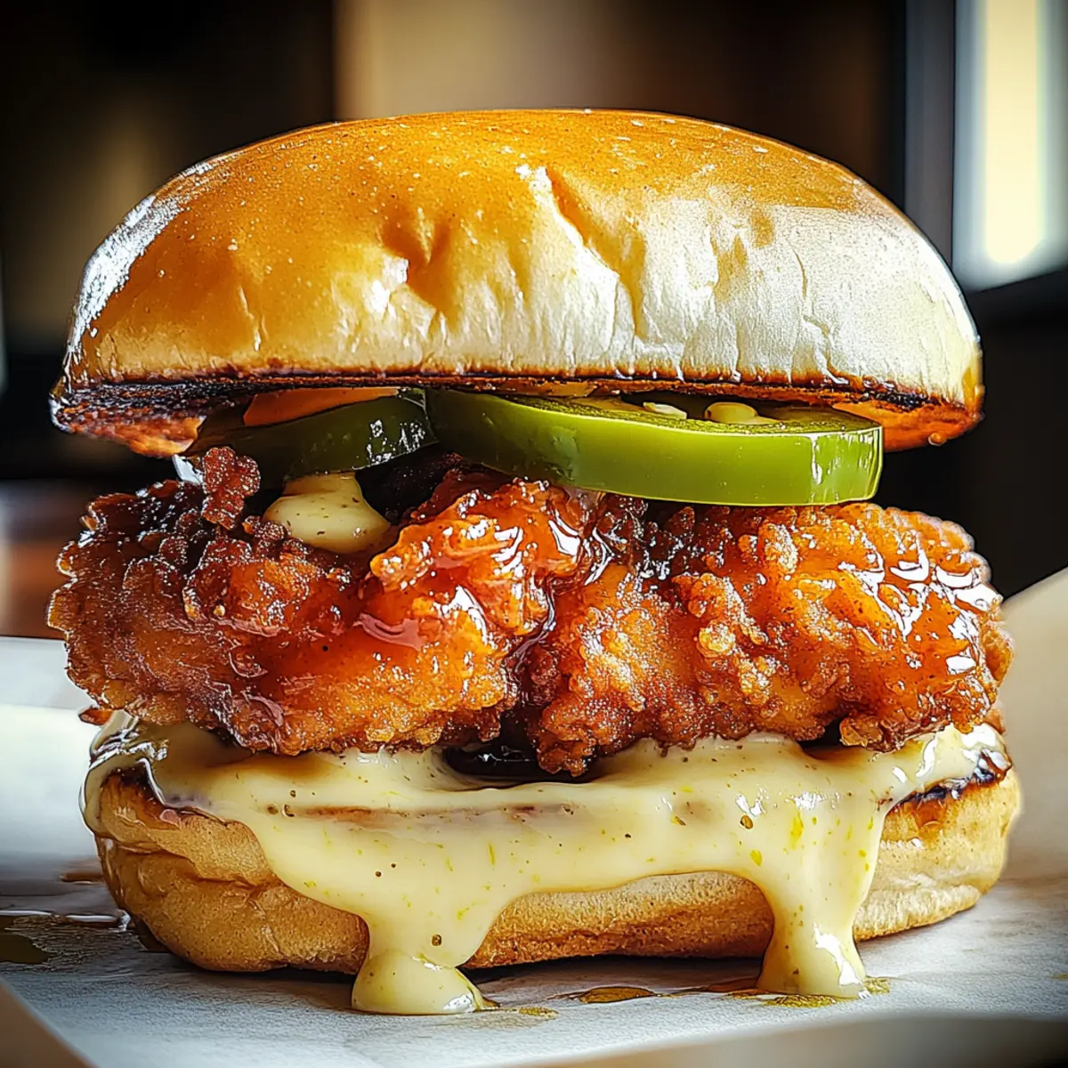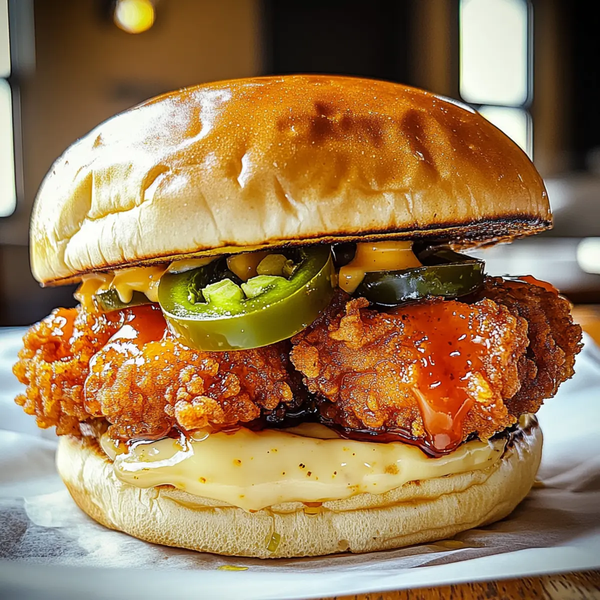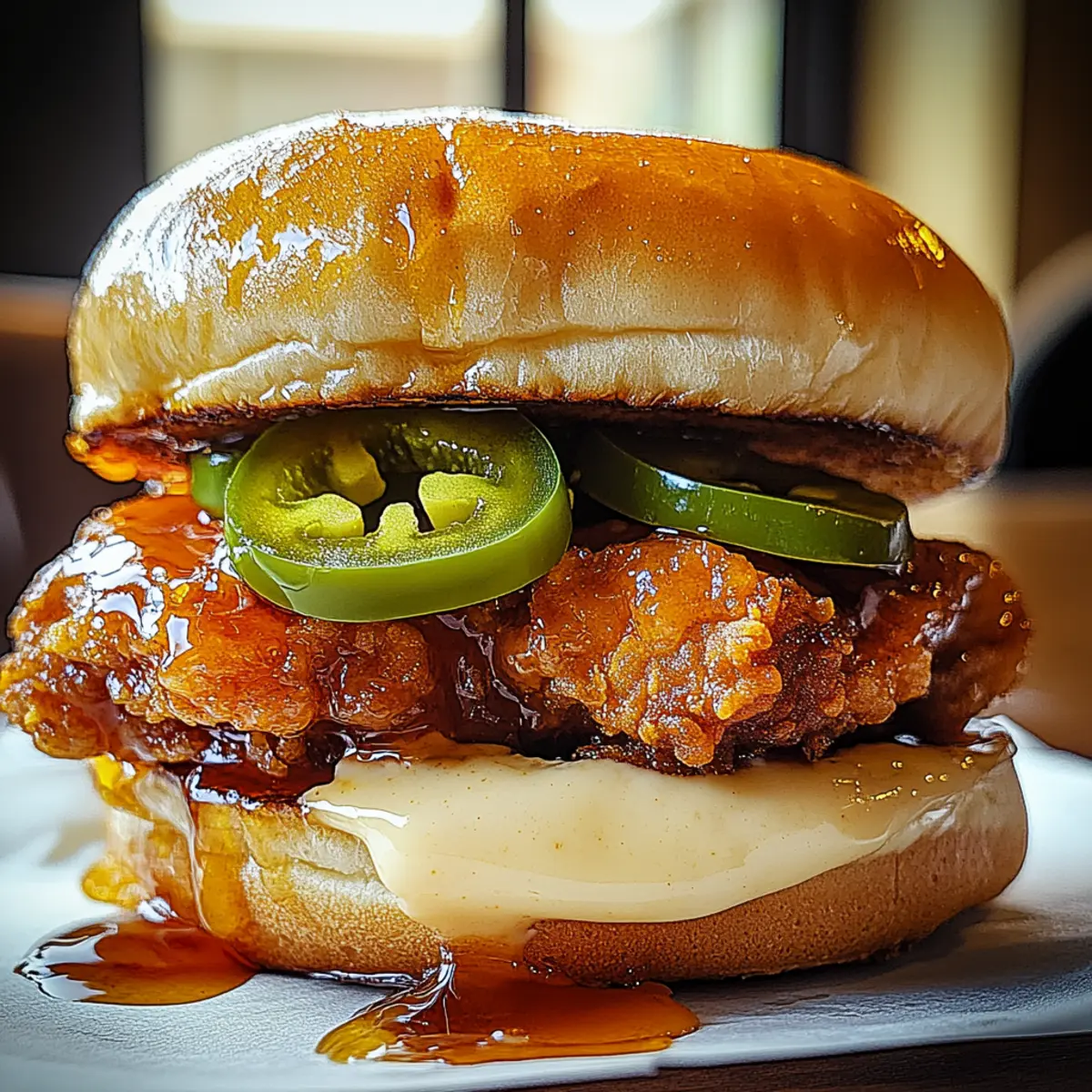 Your Jalapeno Honey Drenched Crispy Fried Chicken Sandwich is now ready to be devoured! Serve immediately for the best crunch and flavor, garnished with your favorite side, like coleslaw or sweet potato fries. The inviting aroma and vibrant presentation will surely impress anyone at your table, making it a satisfying meal for everyone to enjoy!