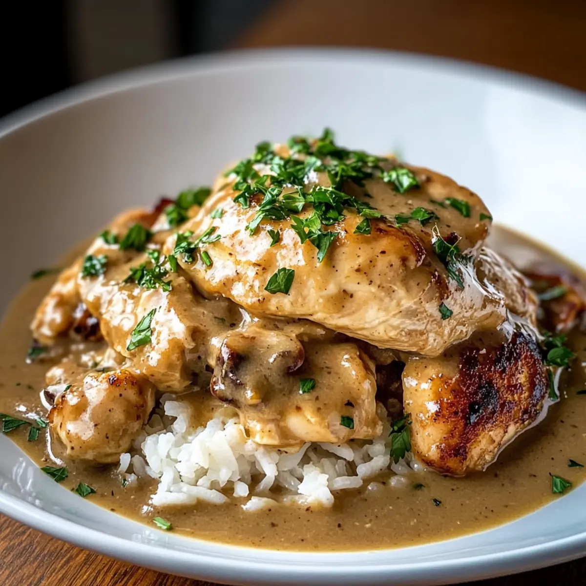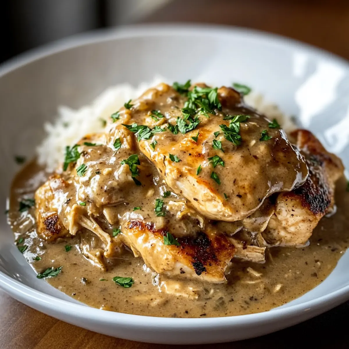 - Serve the shredded chicken and gravy over rice or mashed potatoes, garnished with parsley.
