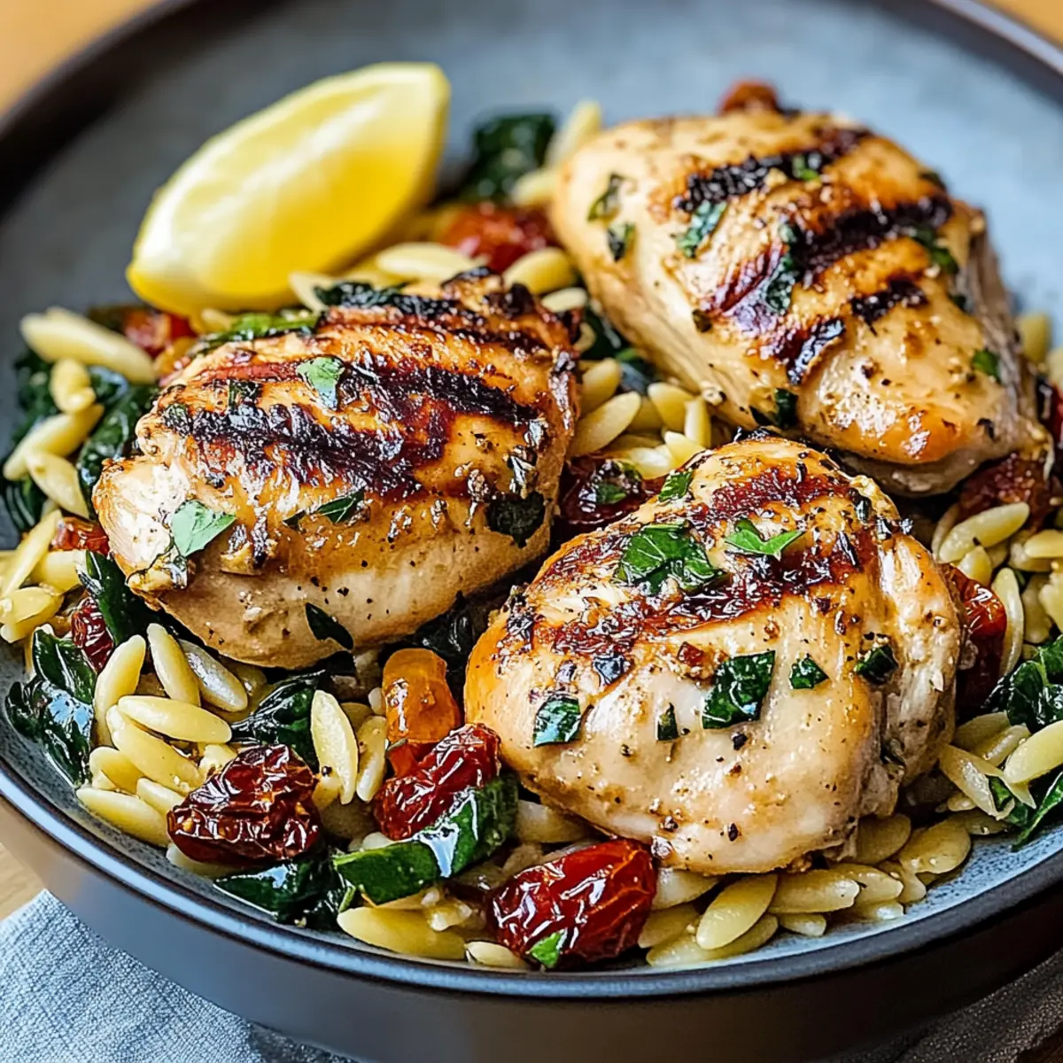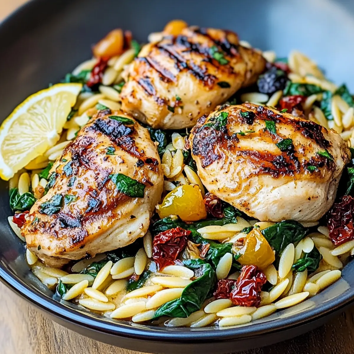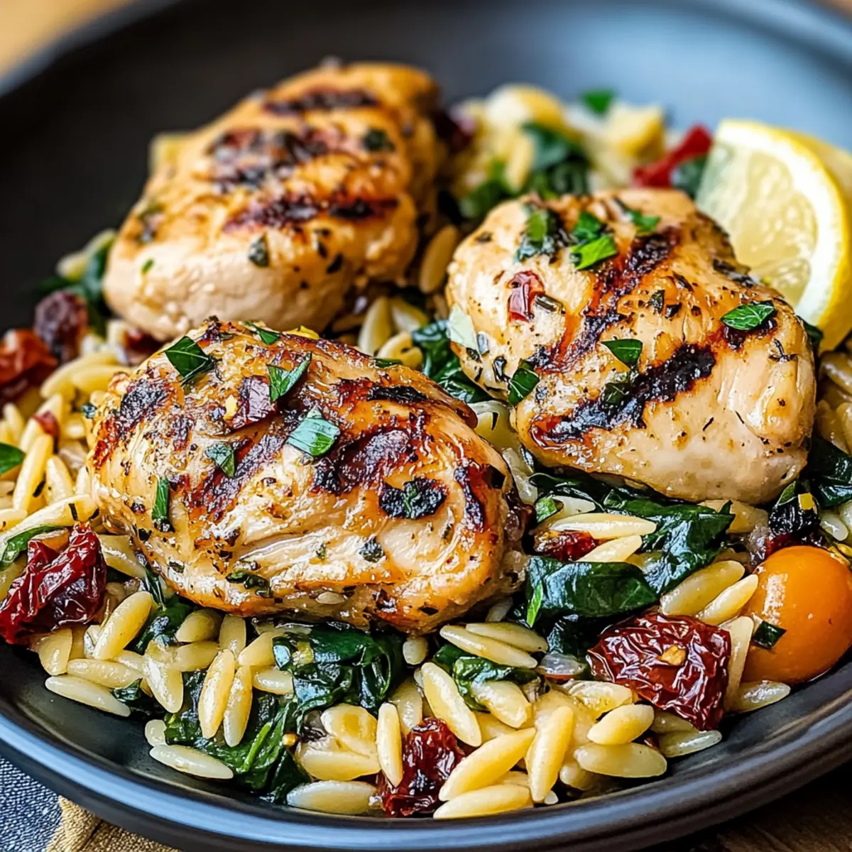 - To serve, plate the orzo mixture, add sliced chicken on top, and garnish with herbs and lemon wedges.
