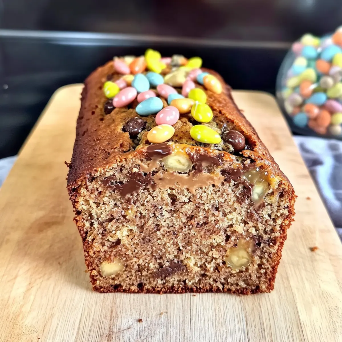 Once done, remove the bread from the oven and allow it to cool in the pan for about 10 minutes before transferring it to a wire rack. Once cooled, drizzle it with melted chocolate and sprinkle additional chopped candies on top to elevate your Easter Banana Bread, turning it into a festive treat perfect for this season!