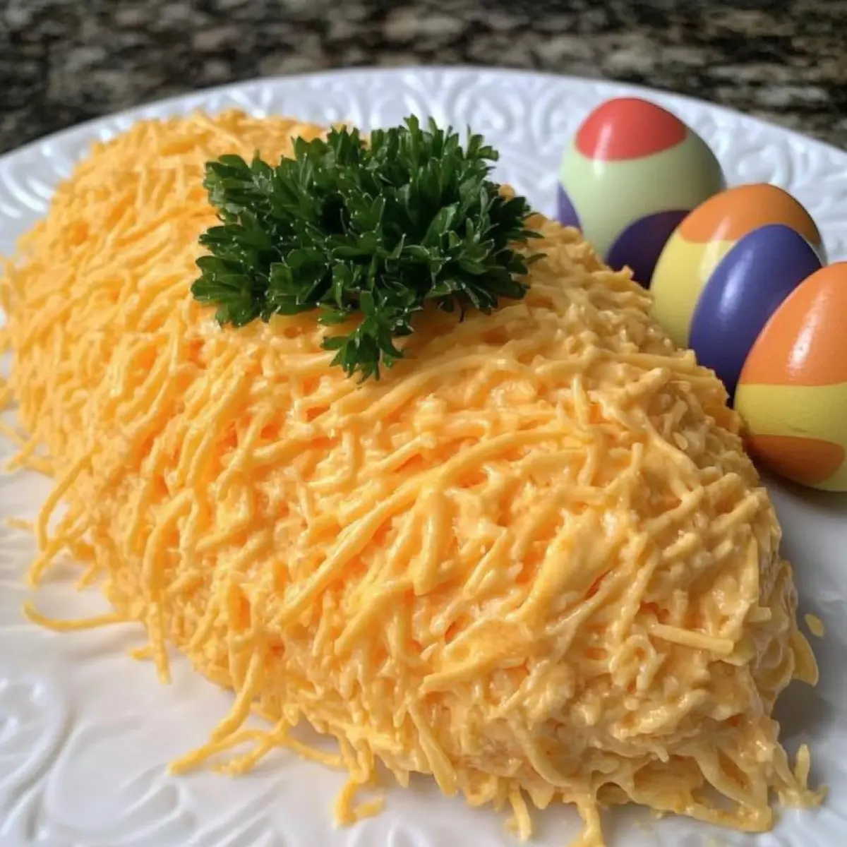 - Arrange fresh parsley at the top of the cheese ball to represent the carrot's leafy greens.