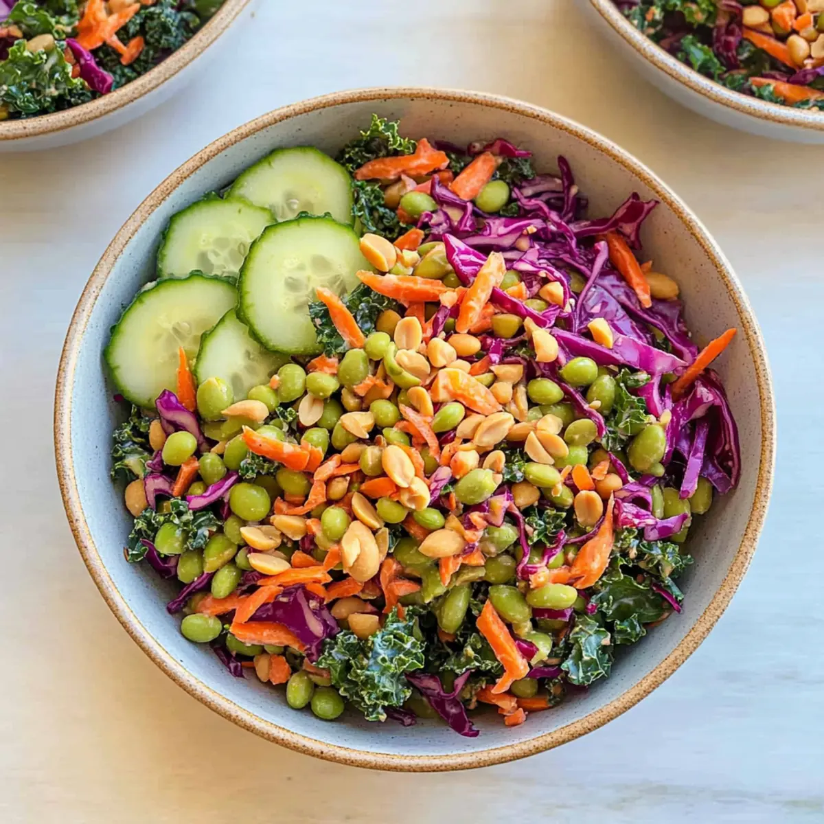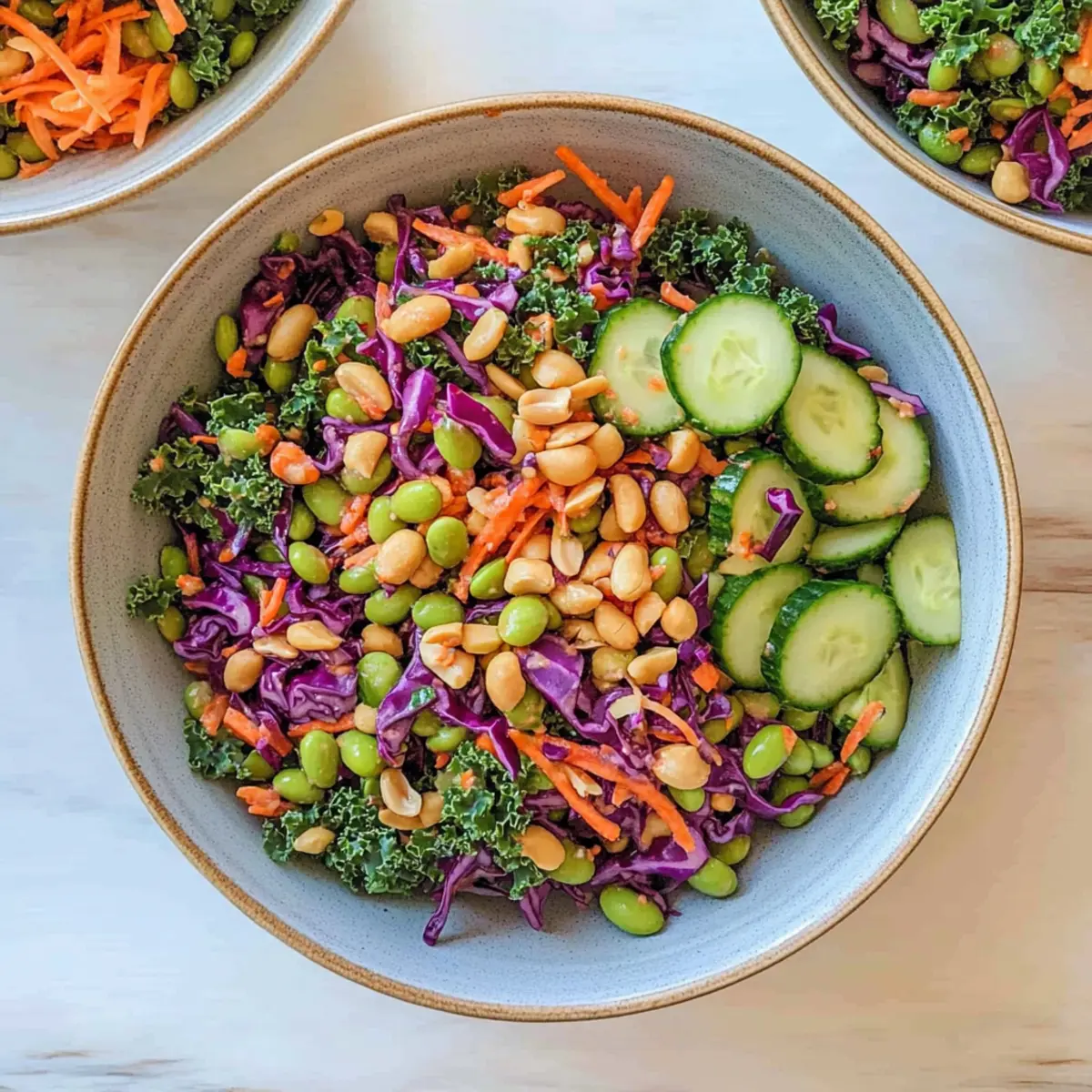 Vibrant Colors: The Edamame Crunch Salad is not just a feast for the taste buds but also for the eyes. With its pops of green from the edamame and kale, combined with the deep purple of red cabbage, this salad stands out on any table.