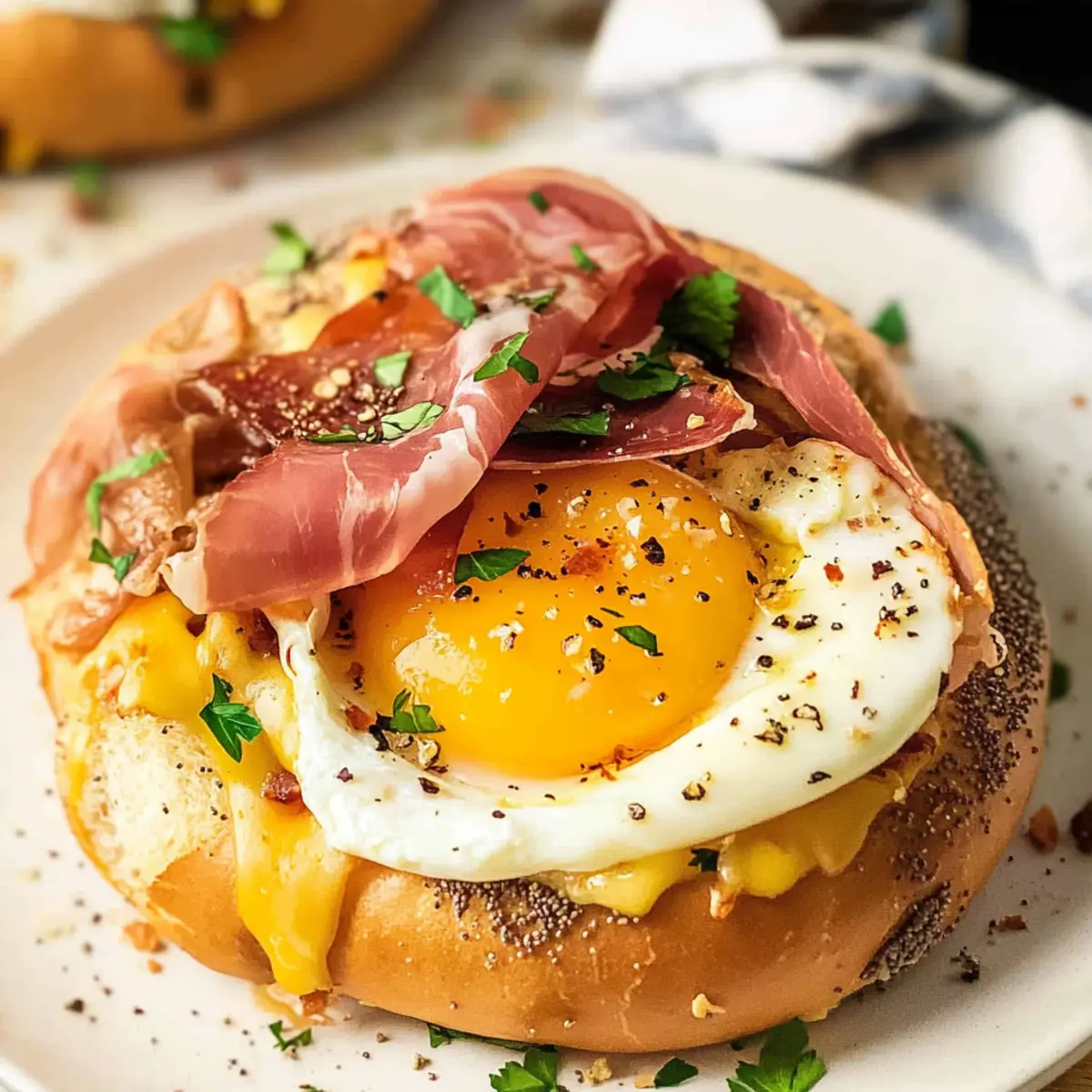 Crowd-Pleasing Favorite: Whether serving guests at brunch or enjoying it solo, this Egg Prosciutto Bagel will impress and satisfy any palate.