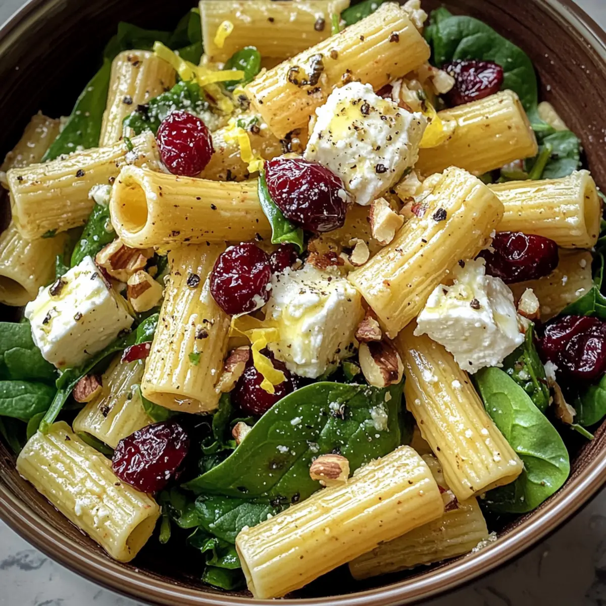 Serving Tip: For the freshest taste, add your spinach just before serving, keeping it crisp and vibrant in your Feta & Cranberry Rigatoni Salad.