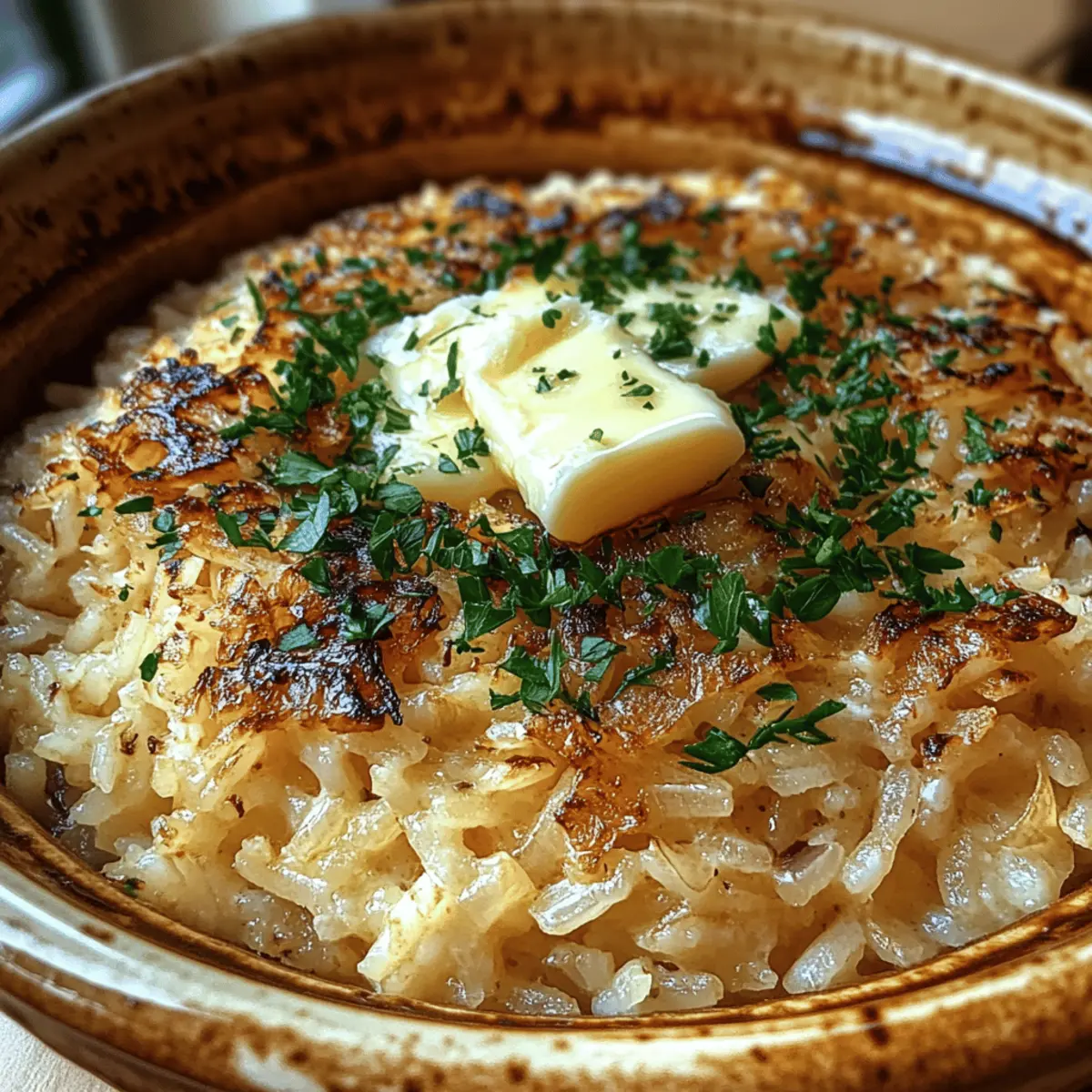 Once the cooking time is up, take the dish out of the oven and let it sit for a few minutes. Use a fork to fluff the rice gently, separating the grains and exposing their buttery richness. Your French Onion Butter Rice is now ready to serve—bright and inviting, it will surely steal the show at your table!