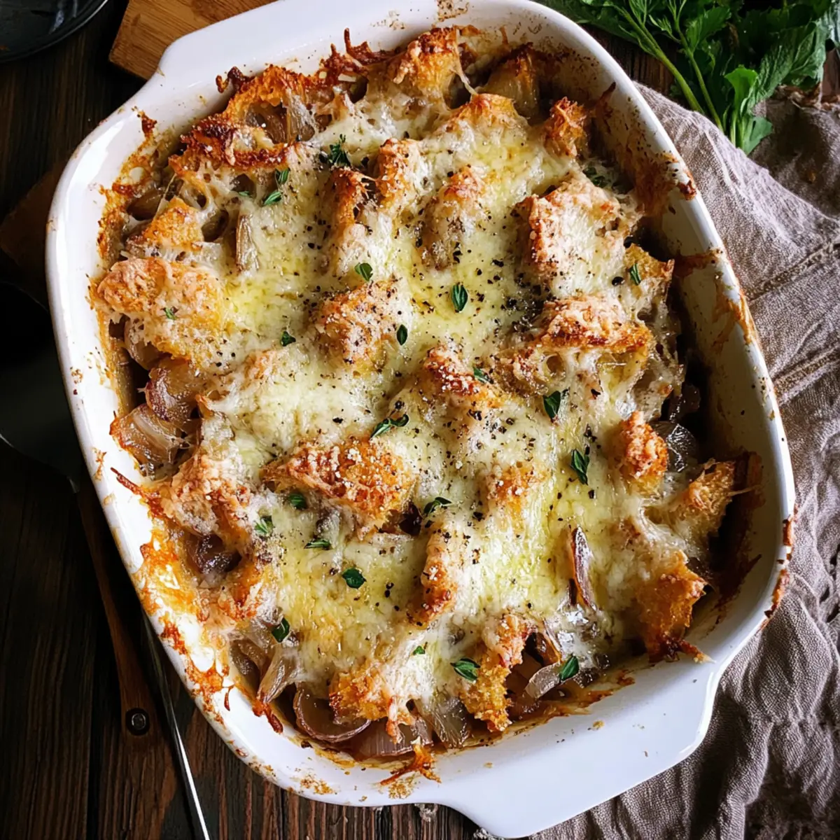 Remove the French Onion Stuffing from the oven, letting it cool slightly before serving. Garnish with freshly cracked black pepper and sprigs of thyme for a burst of freshness. This stuffing is the perfect accompaniment to your holiday feast, ready to impress your family and friends!