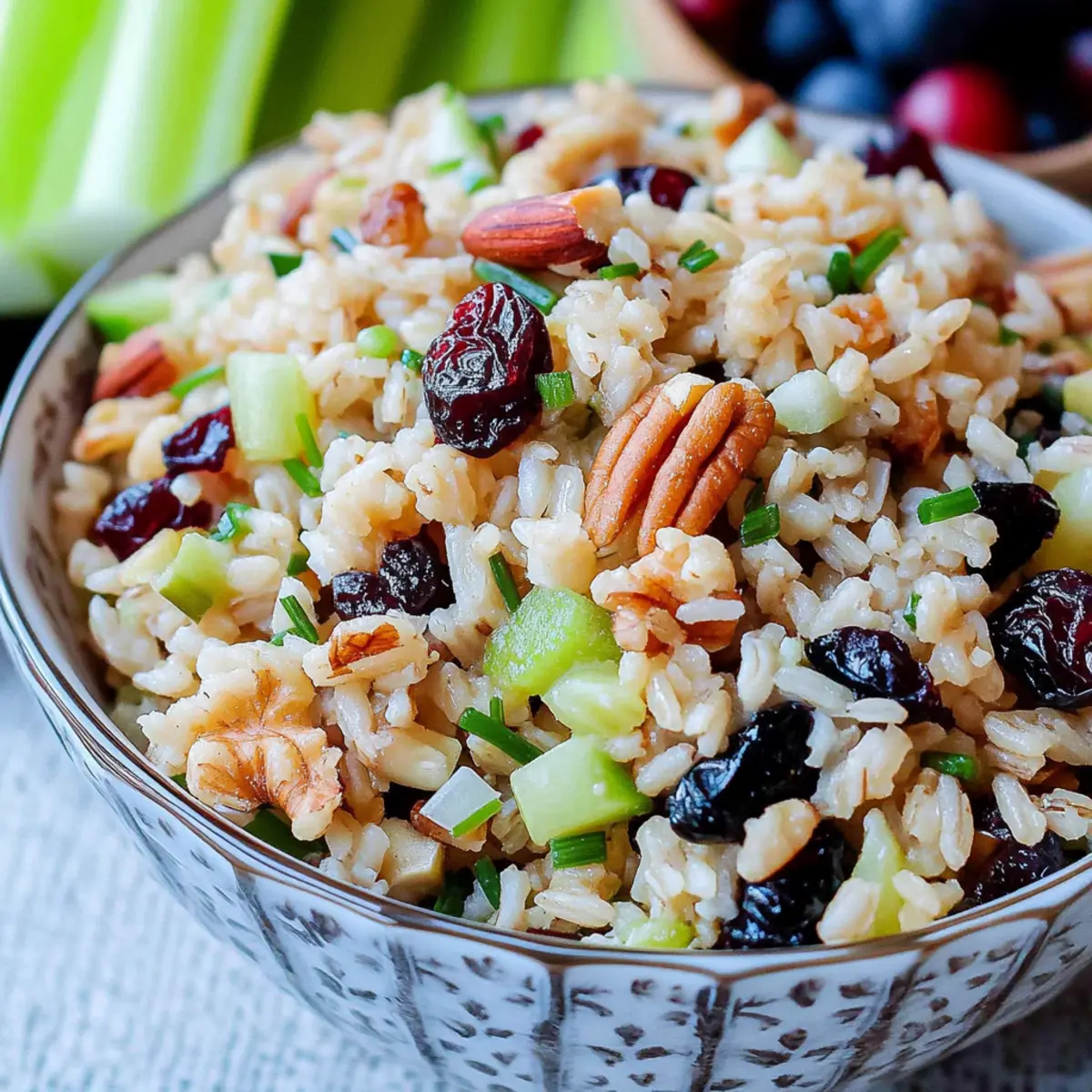 - In a large bowl, combine cooked rice, chopped celery, chives, and onion. Fold in cranberries, blueberries, pecans, and walnuts.