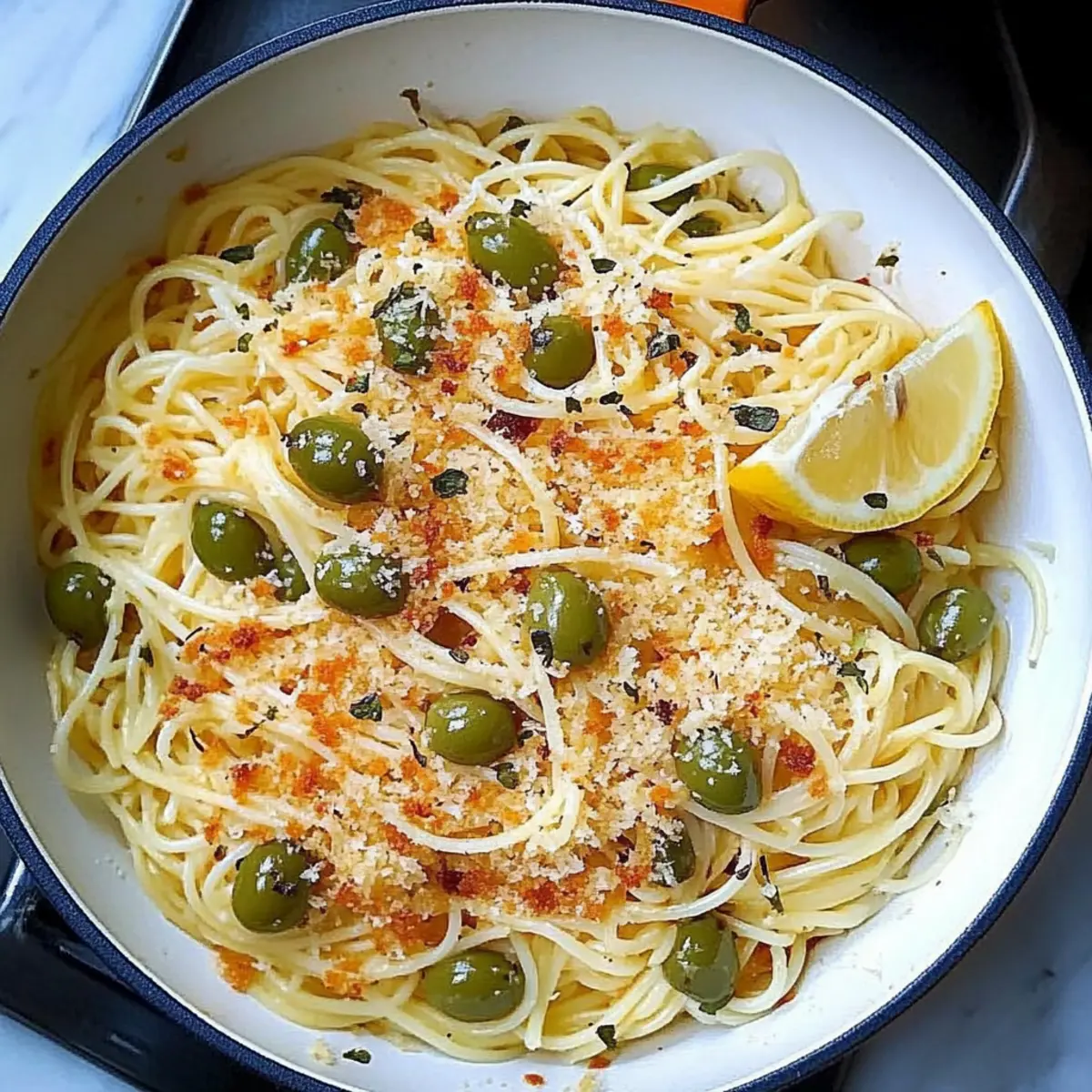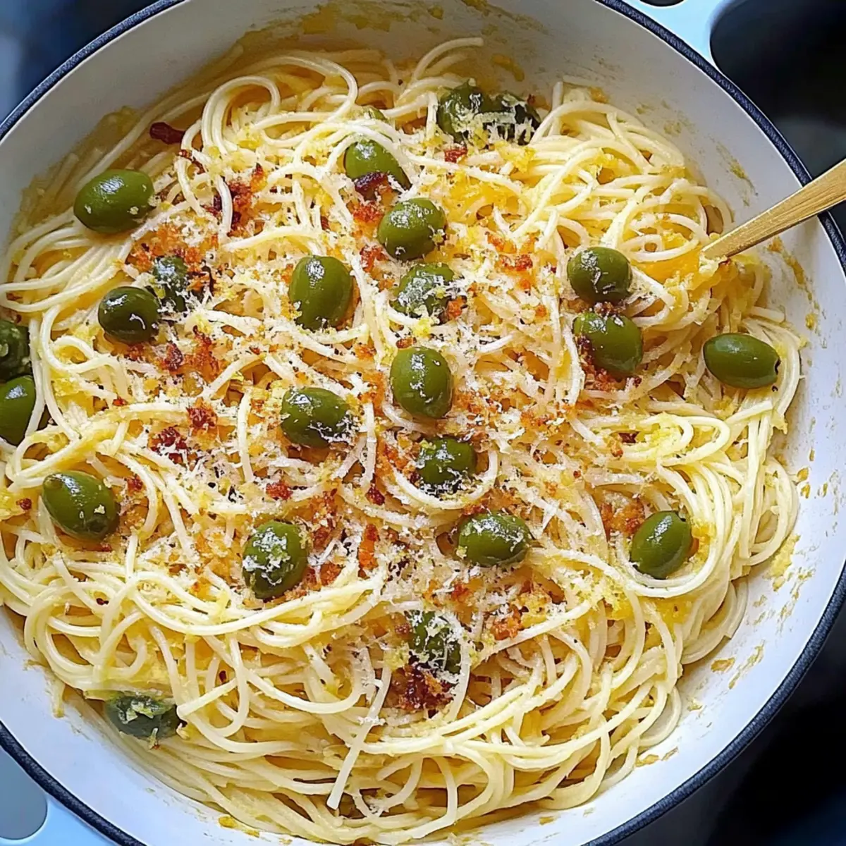 These delightful Green Olive Capellini are perfect for meal prep enthusiasts looking to save time during busy weeknights! You can prepare the lemon-garlic panko breadcrumbs up to 24 hours in advance; simply store them in an airtight container at room temperature to keep them crispy. The capellini can also be cooked ahead and refrigerated for up to 3 days. When ready to serve, quickly reheat the pasta in a pan with a splash of reserved pasta water, add the olive sauce, and toss everything over medium heat until warmed through. With these steps, you’ll have a vibrant, satisfying meal ready in no time, just as delicious as when freshly made!