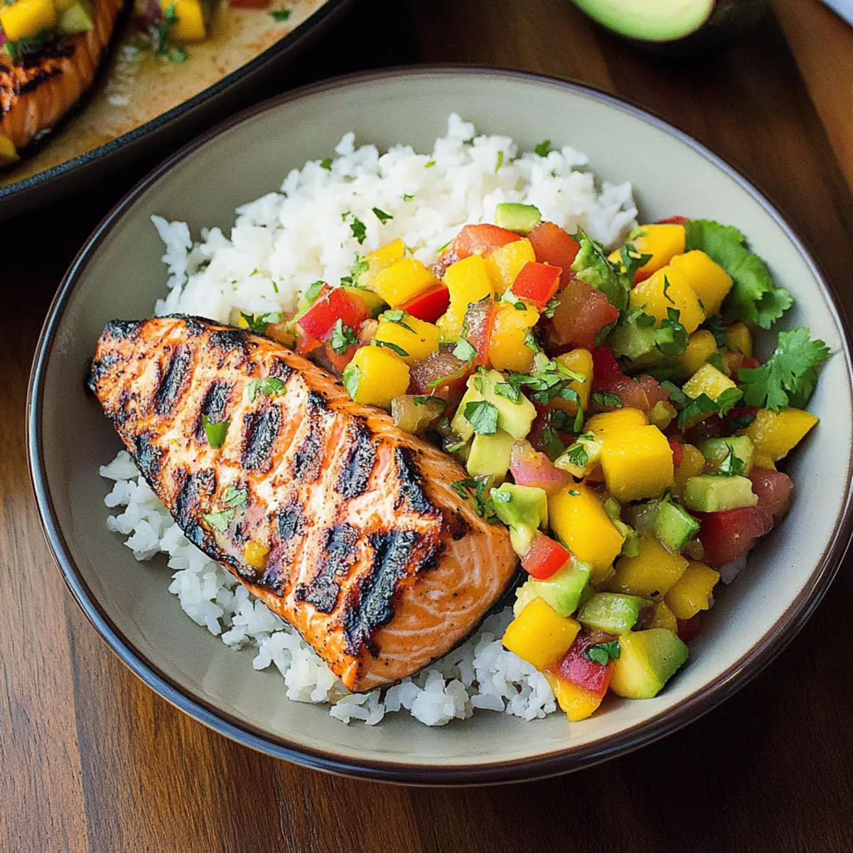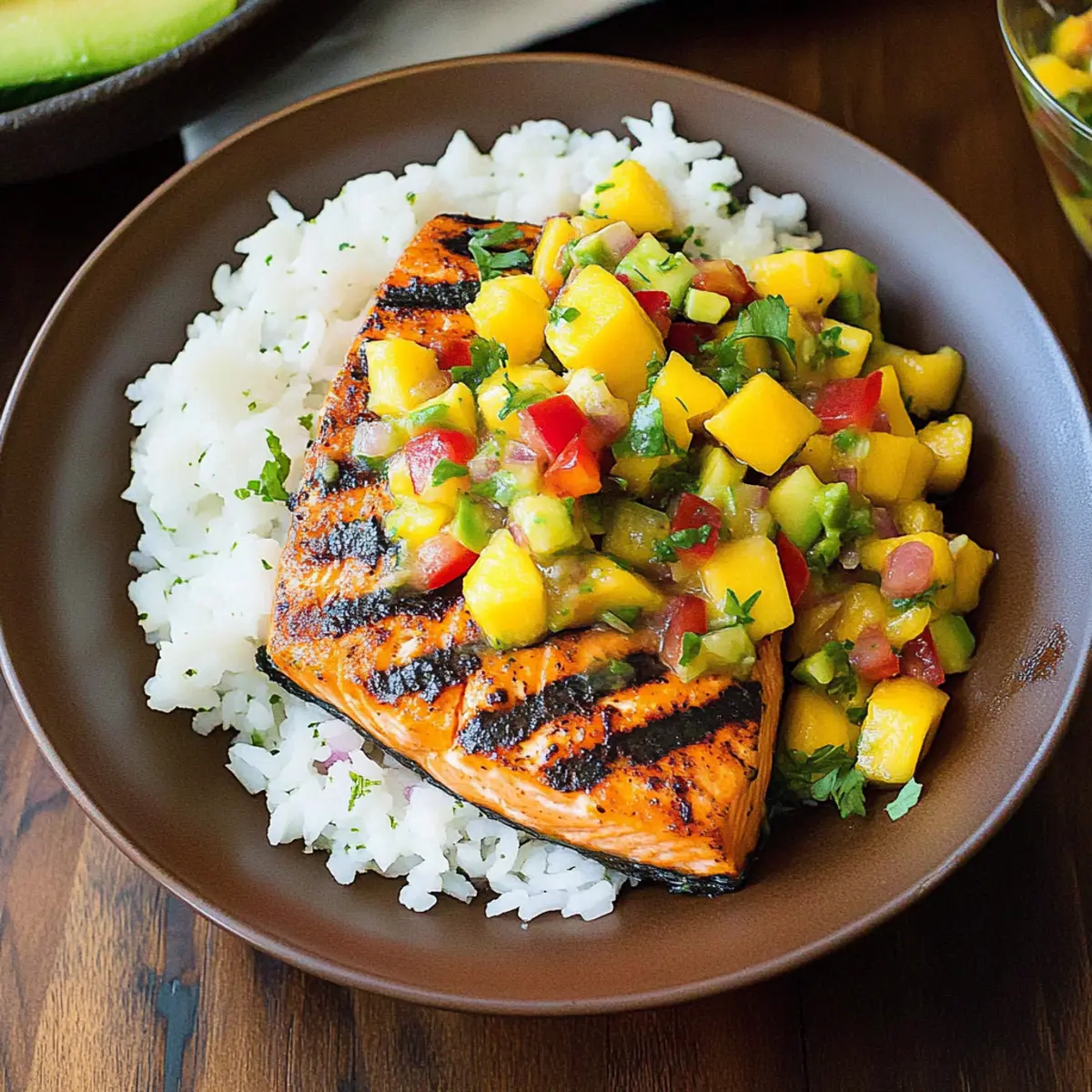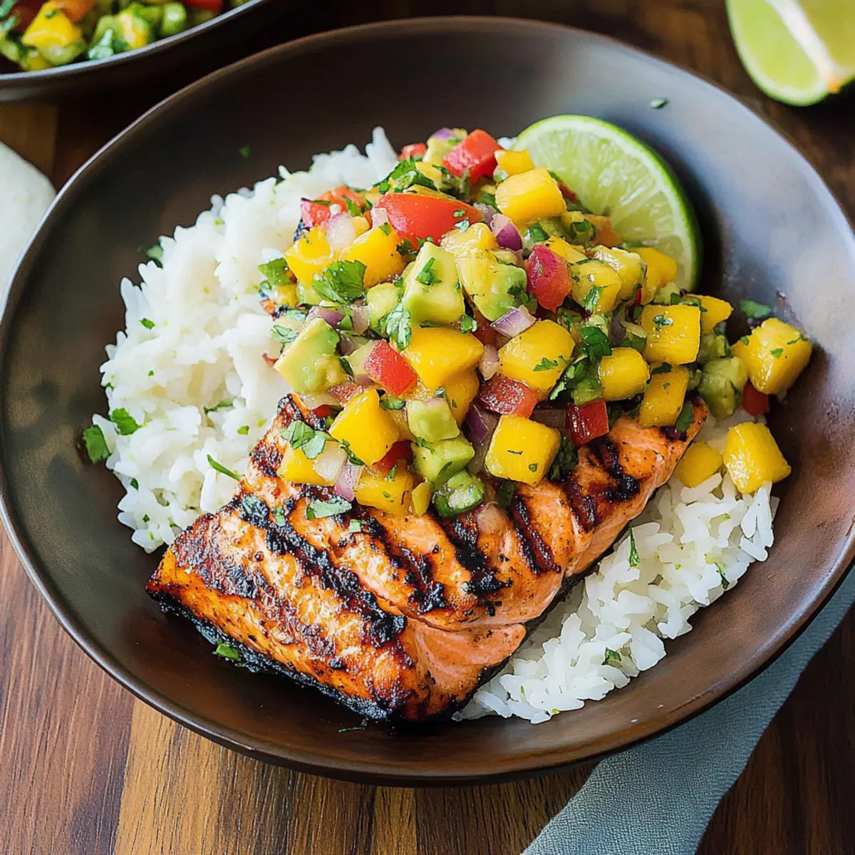 - Serve the fragrant coconut rice on a platter, top with grilled salmon and spoon over mango salsa. Optionally, serve with lime wedges.