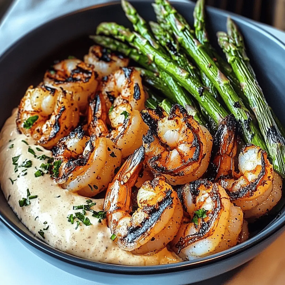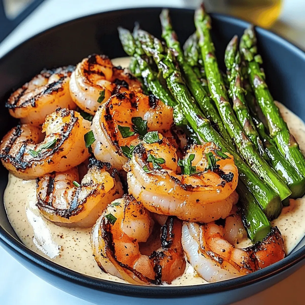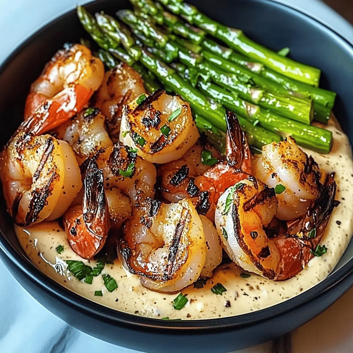 - Assemble the bowl with grilled asparagus at the base, topped by shrimp, and serve creamy garlic sauce on the side.