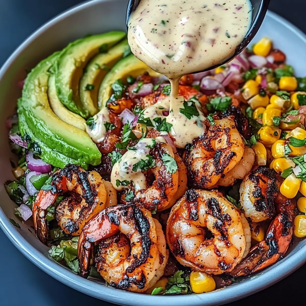 In a small bowl, whisk together mayonnaise, sour cream, chopped cilantro, fresh minced garlic, lemon juice, salt, and pepper until the mixture is smooth and creamy. This sauce will enhance the richness of your Grilled Shrimp Bowl, adding a delightful garlicky finish that complements the shrimp and corn salsa beautifully.
