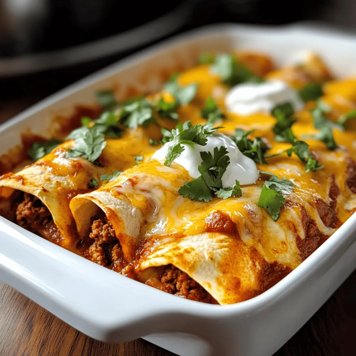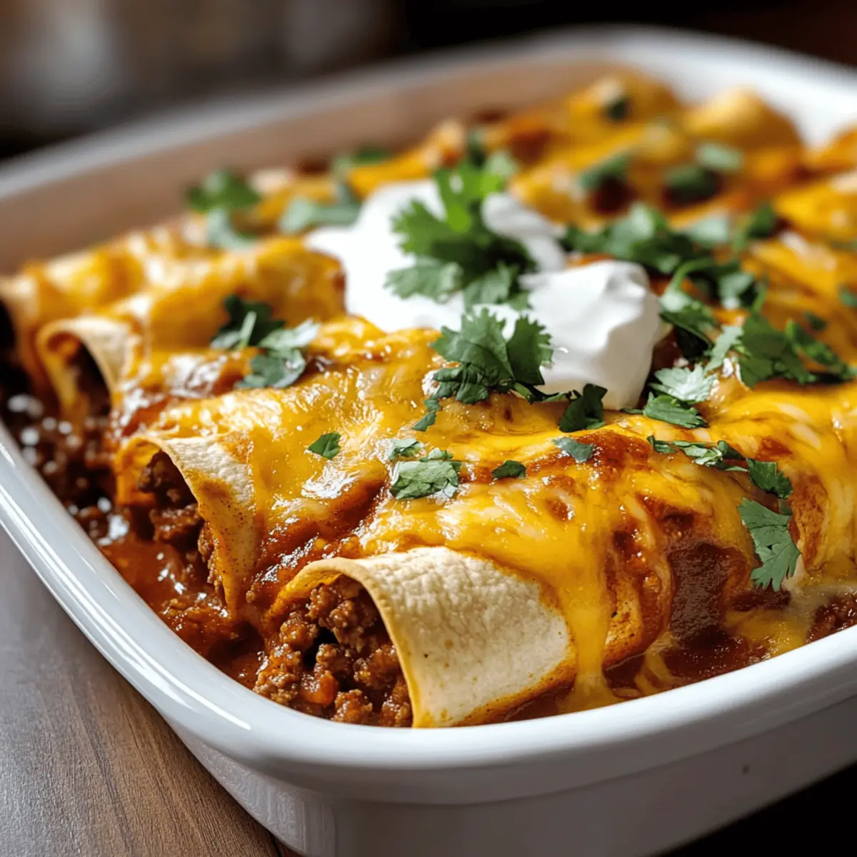 After baking, let the Ground Beef Enchiladas cool slightly before serving. This brief resting period allows the flavors to meld beautifully. Garnish with dollops of sour cream and a sprinkle of fresh cilantro for a pop of flavor and color, enhancing your family’s dining experience.