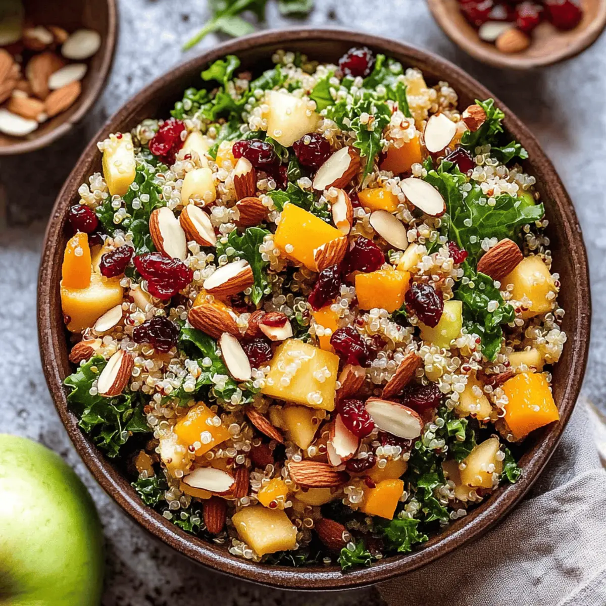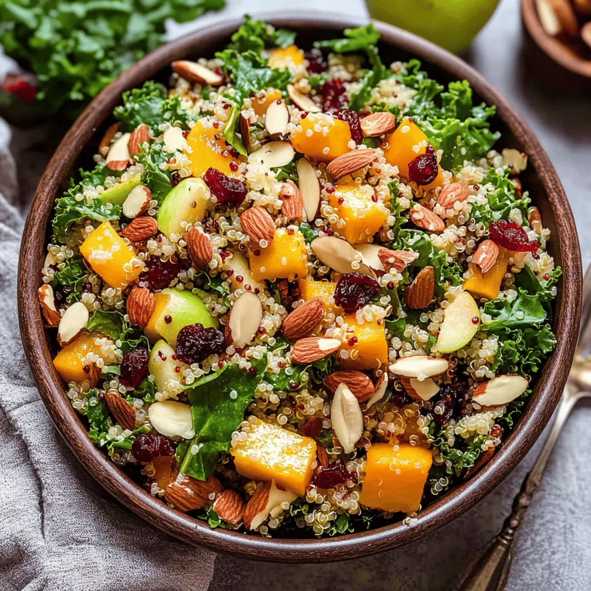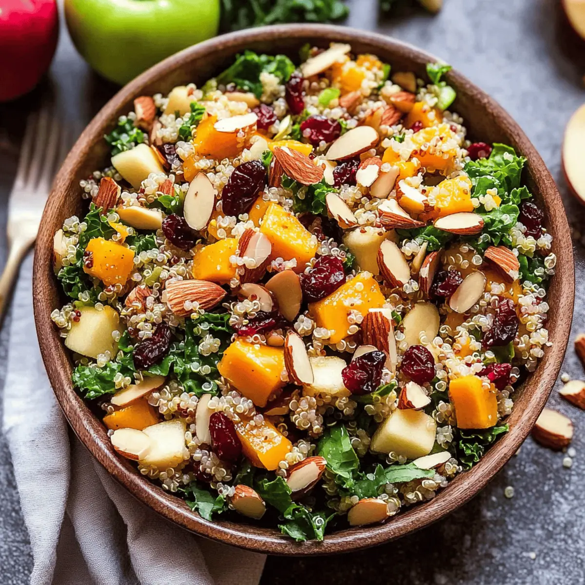 - Combine the Salad Ingredients: In a large bowl, mix cooled quinoa, roasted squash, diced apple, sliced green onions, kale/spinach, dried cranberries, almonds, and pepitas.