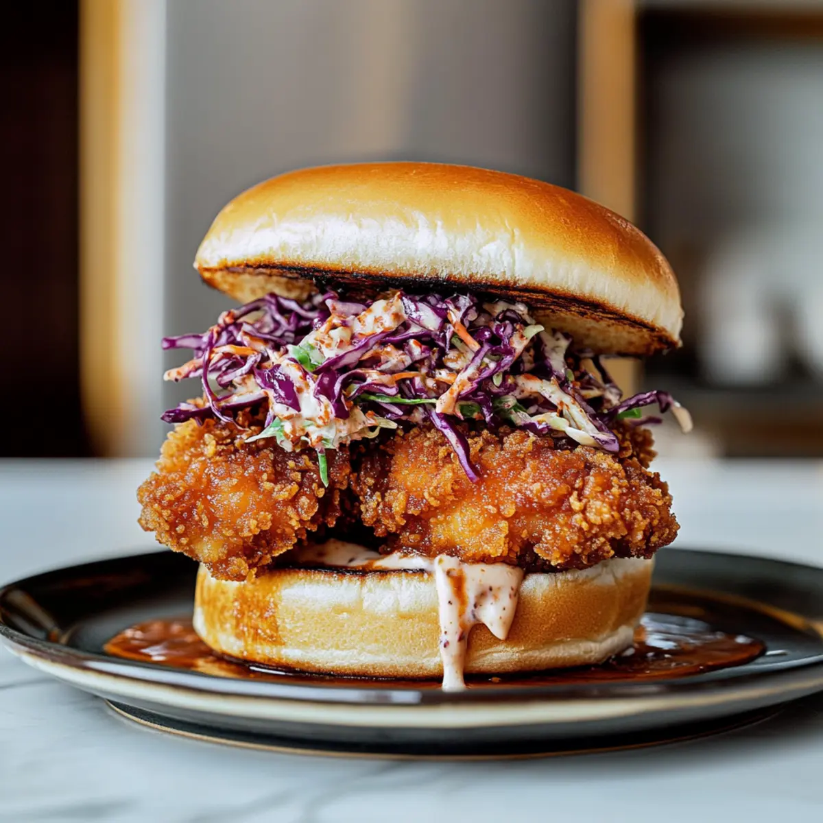 - Assemble Sandwich: Place fried chicken on each bun and top with ponzu slaw. Season with lemon, salt, and pepper.