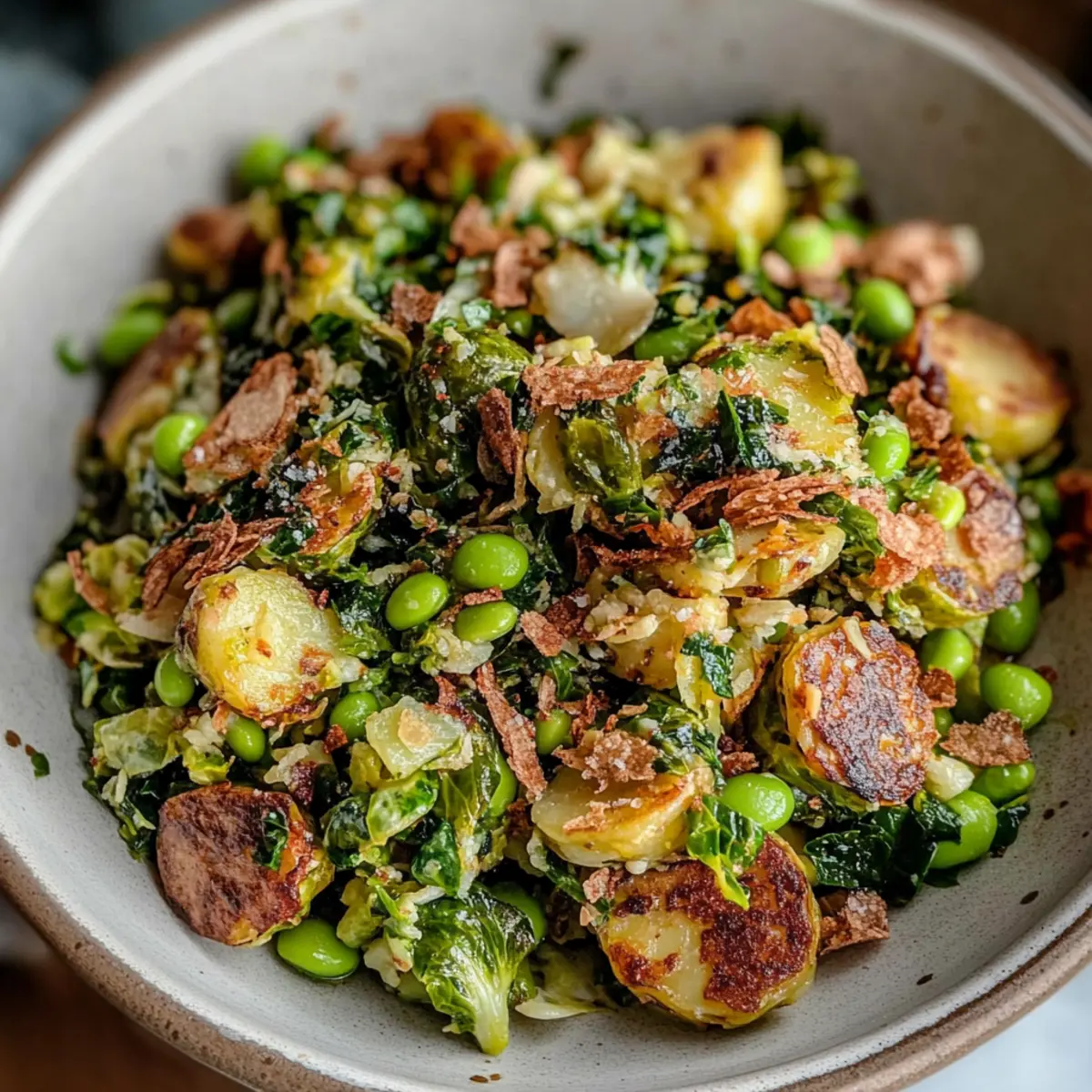 - In a mixing bowl, combine smashed potatoes with roasted Brussels sprouts, shallots, kale, edamame, and chives. Drizzle with dressing and toss gently.