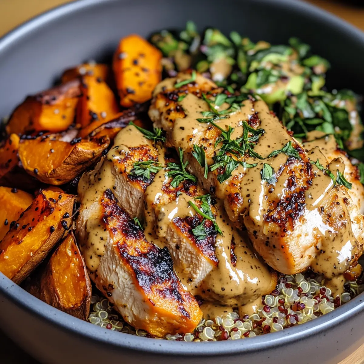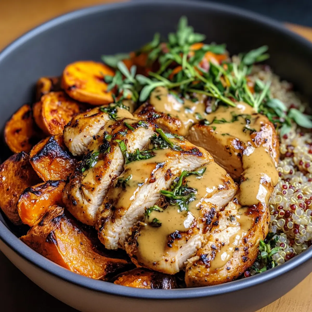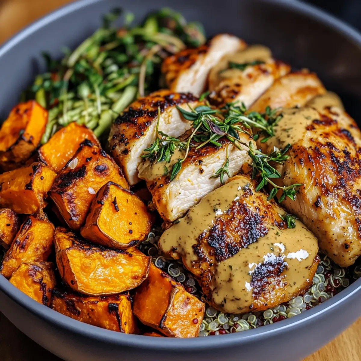 Once everything is cooked, slice the chicken into bite-sized pieces. To assemble, start with a generous scoop of quinoa or rice in each bowl, followed by a portion of roasted sweet potatoes and slices of chicken. Garnish with fresh herbs like parsley or cilantro for added color and flavor, bringing your Maple Dijon Chicken & Sweet Potato Bowls together beautifully.