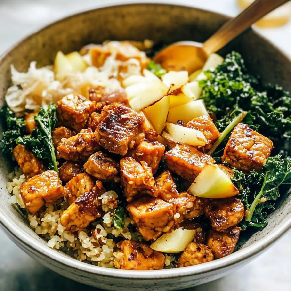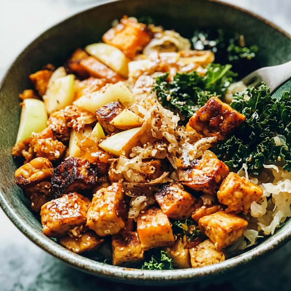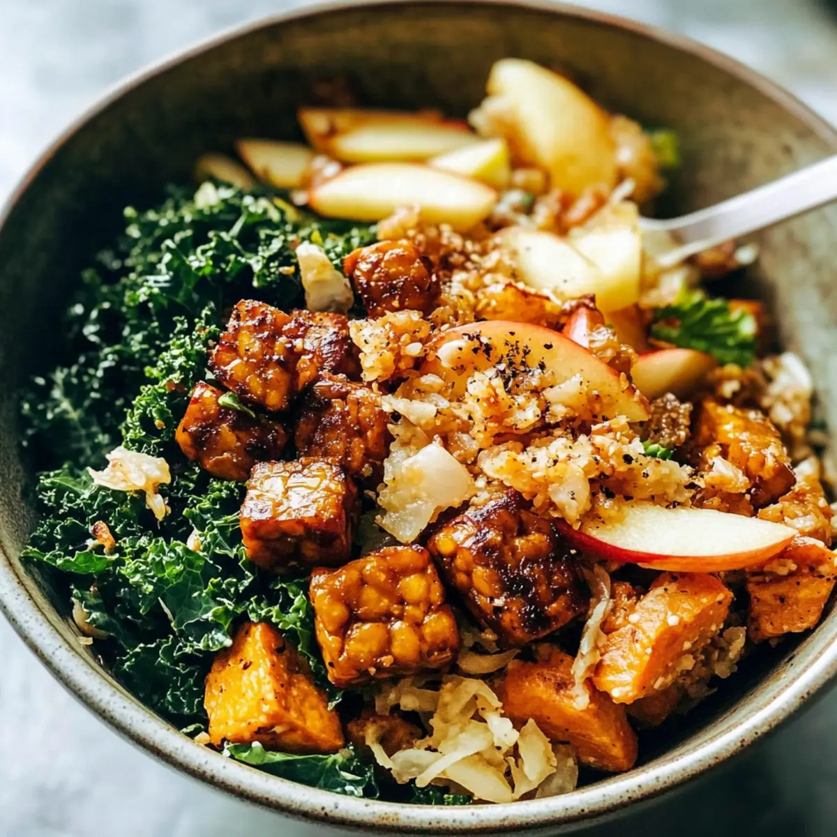 - Assemble Bowls: In a bowl, layer massaged kale, roasted sweet potatoes, and tempeh, then add chopped apple and sauerkraut.