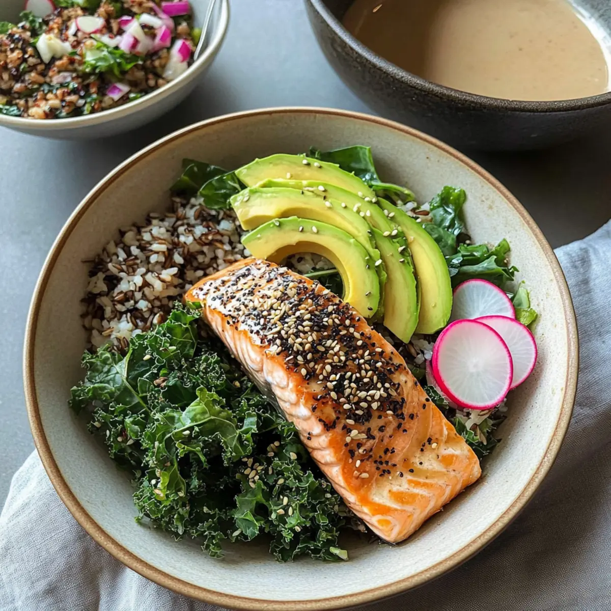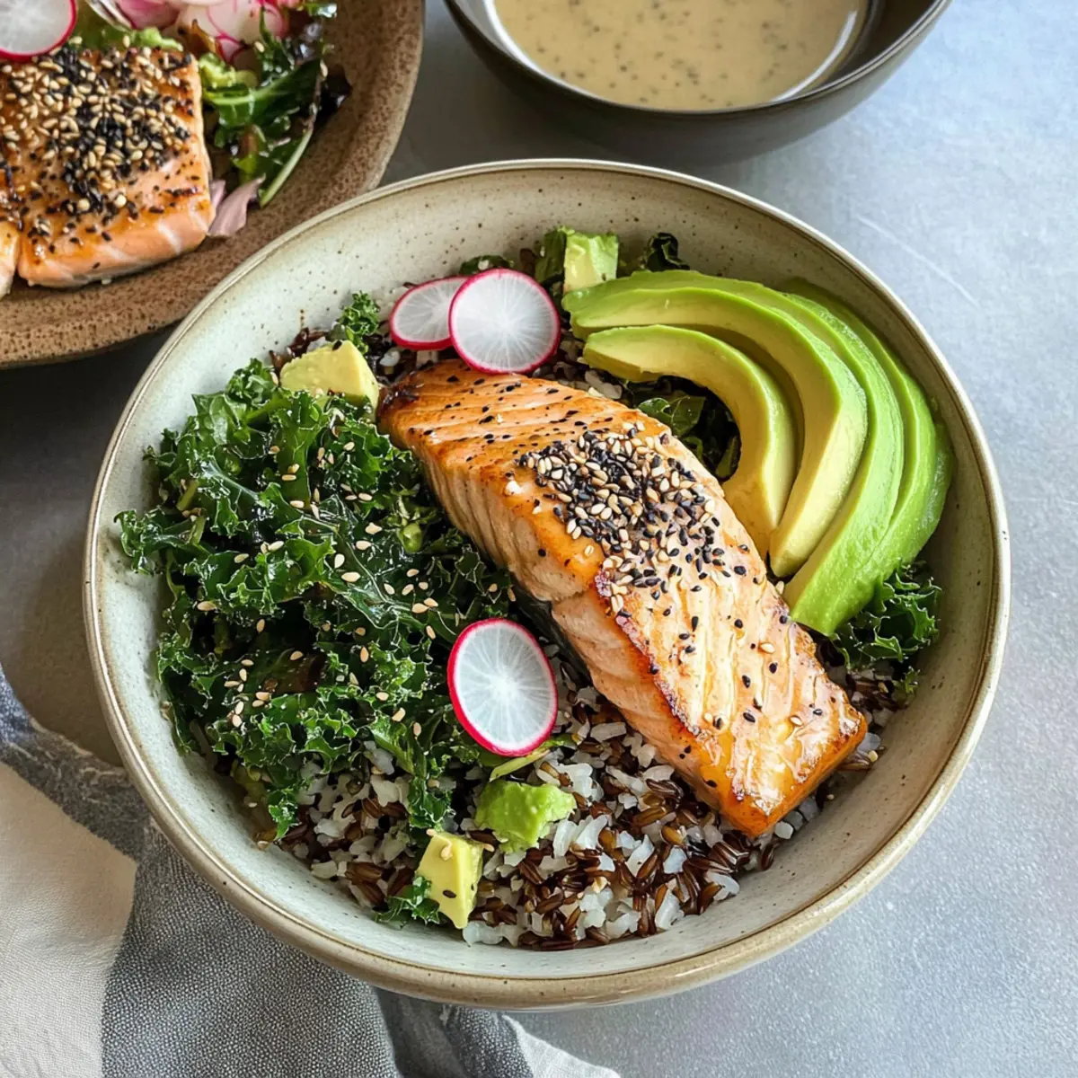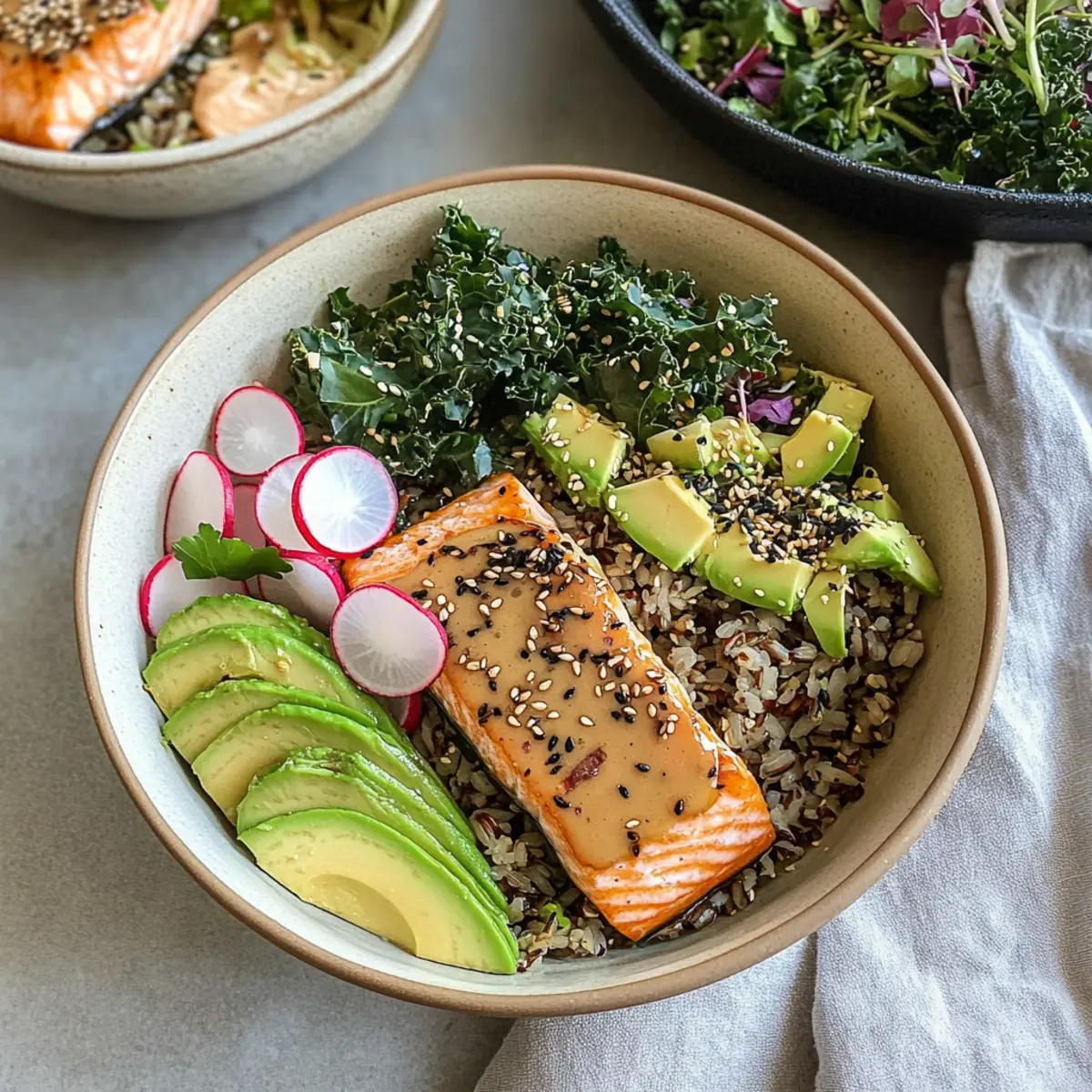 To create your Maple Tahini Salmon Bowls, start with a generous scoop of the wild rice and kale mixture at the bottom of each bowl. Layer the roasted salmon fillet on top, then add slices of creamy avocado and radish for crunch. Complete with a drizzle of the remaining tahini sauce and a sprinkle of microgreens for a stunning presentation.