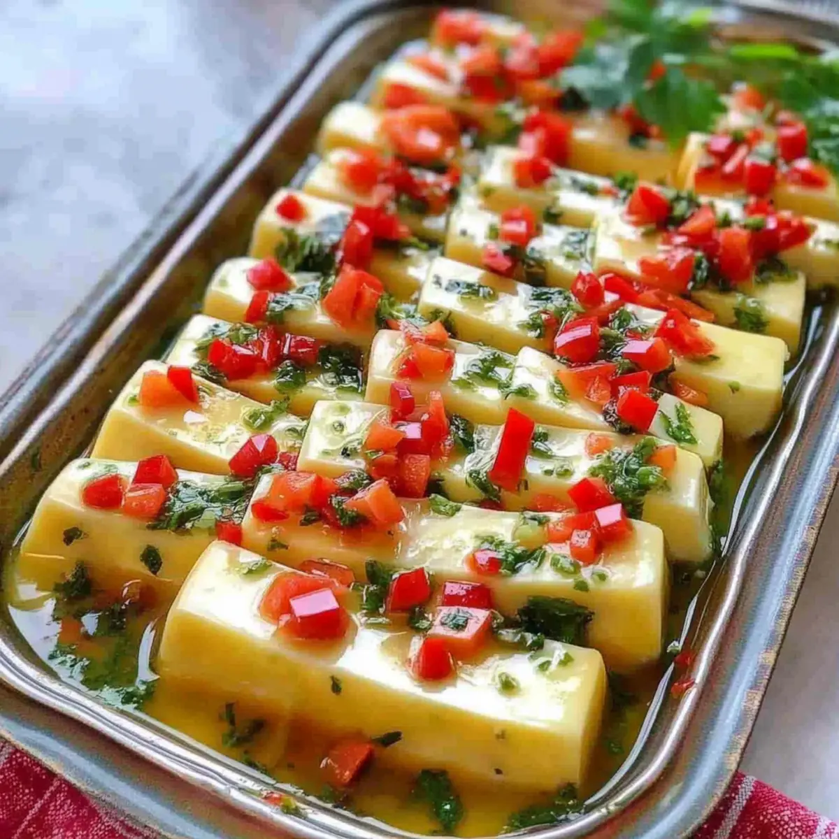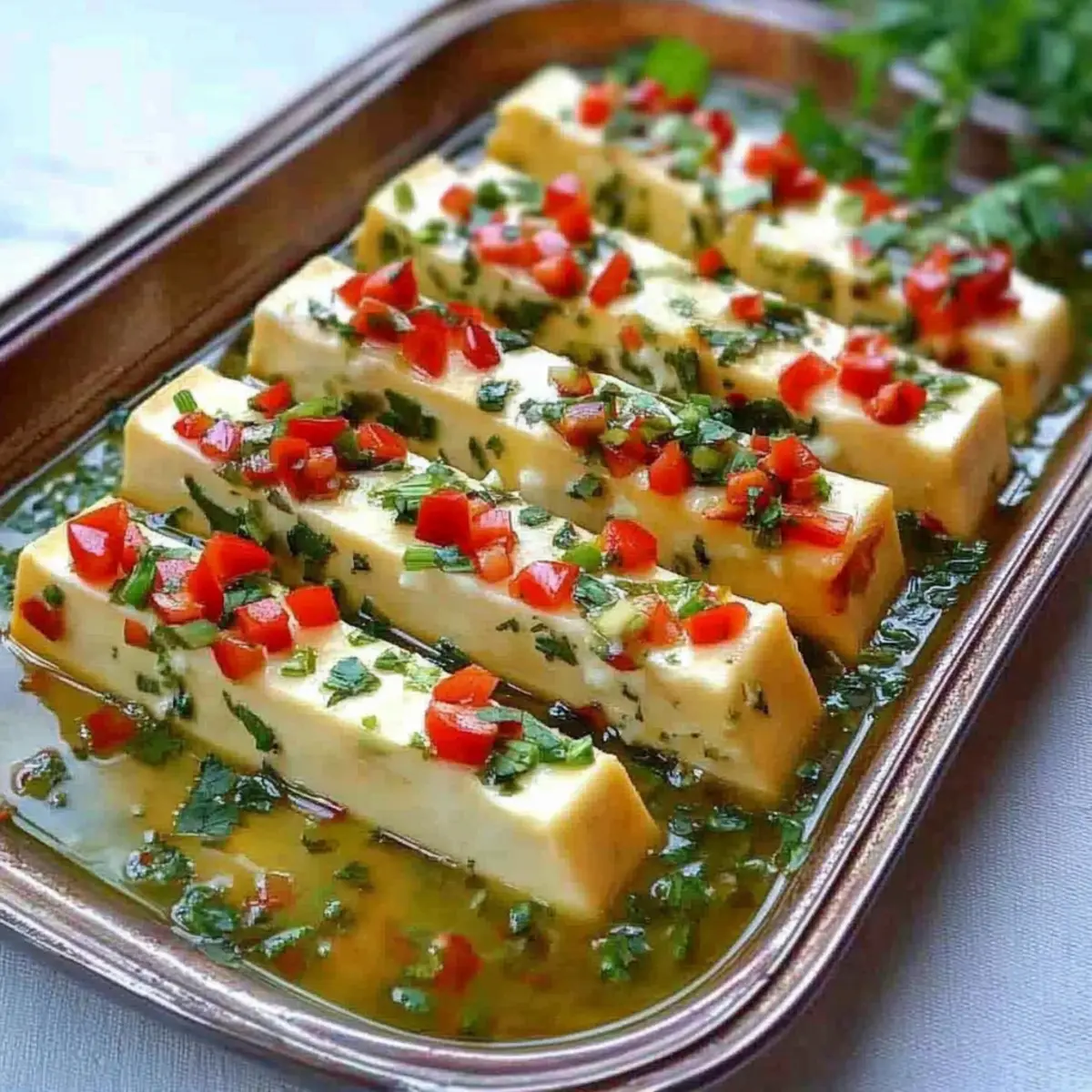 - Once the cheese is arranged, carefully pour the prepared marinade over the cheese slices, ensuring each piece gets adequately coated. Cover the dish with plastic wrap and refrigerate for 6 to 8 hours.