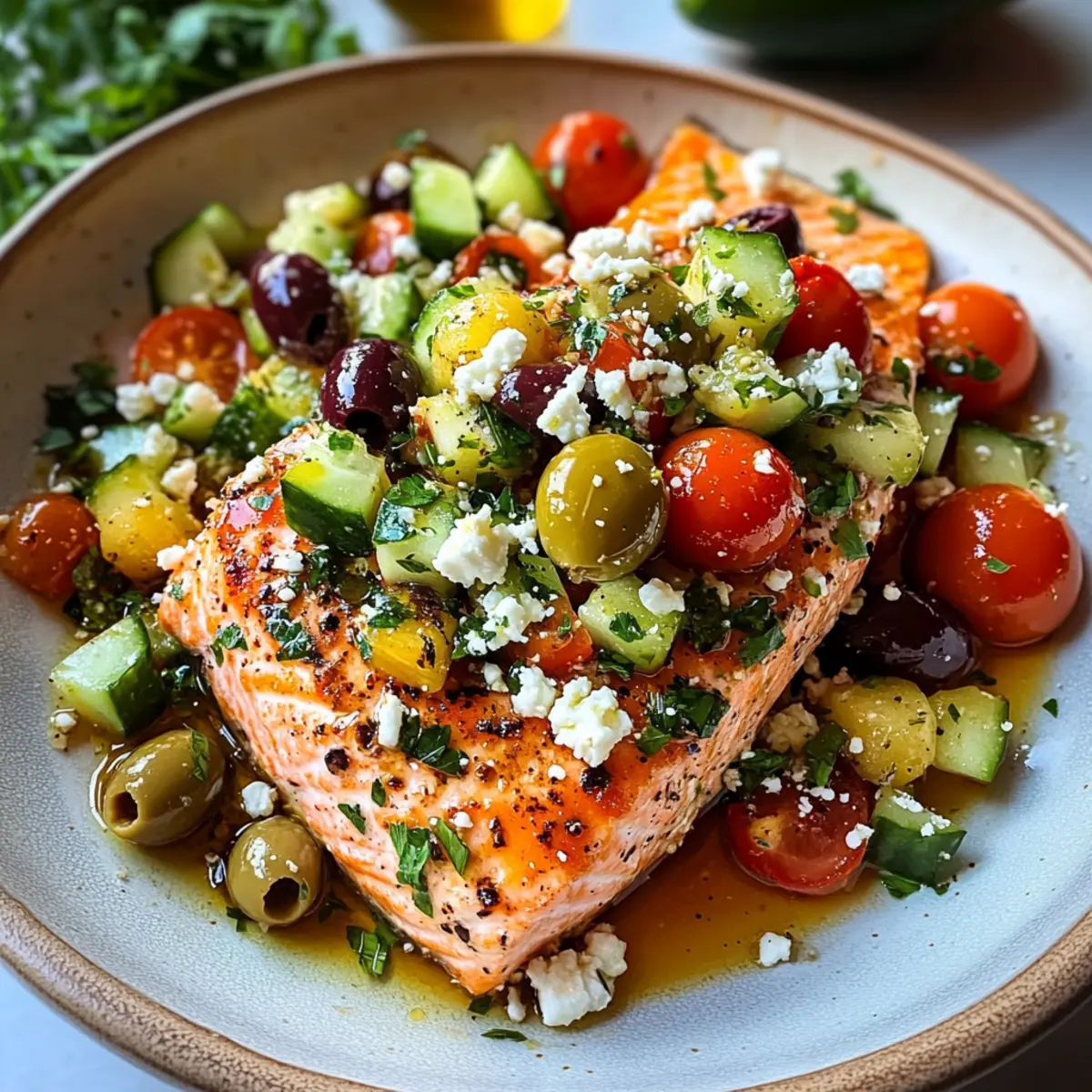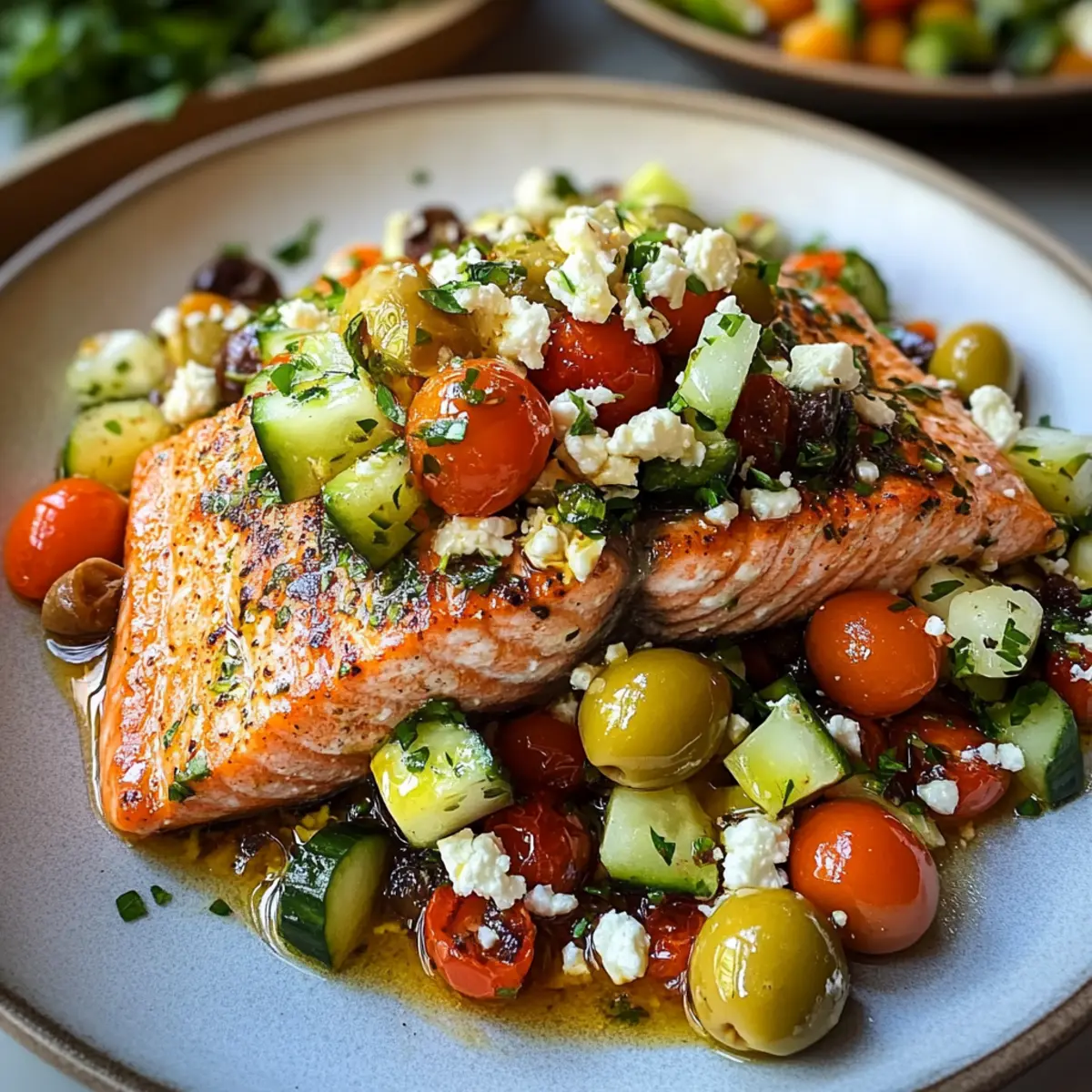 In a separate bowl, mix together cherry tomatoes, green olives, cucumber, parsley, basil, and crumbled feta cheese. Drizzle with a touch of olive oil and season with salt and pepper to taste. Stir gently to combine, allowing the freshness of the vegetables to shine in this vibrant topping for your Mediterranean Salmon.
