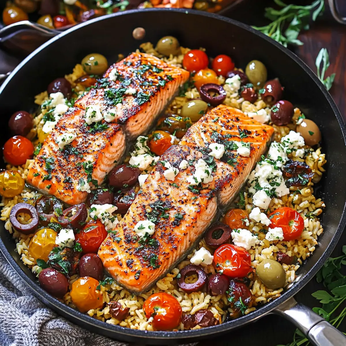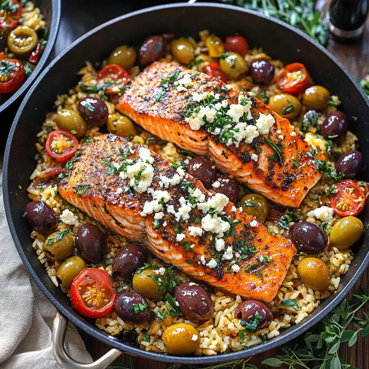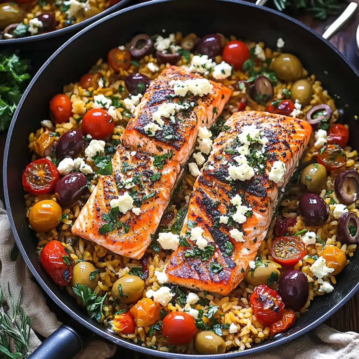 As I stood in my kitchen the other evening, the scent of smoky paprika filled the air, weaving its way around sun-kissed tomatoes and briny olives. That’s when I knew it was time for a delightful Mediterranean Salmon! This one-pan wonder cooks up in just 30 minutes and packs a healthy punch, making it the perfect go-to dinner for busy nights or entertaining friends. With bright flavors and a gluten-free twist, you’ll find that it’s not just a meal; it’s an experience. Imagine tender salmon nestled next to fluffy rice and hearty chickpeas, all harmonizing beautifully under a sprinkle of tangy feta. What’s your favorite ingredient to elevate a simple dish like this? Let’s dive into the recipe!