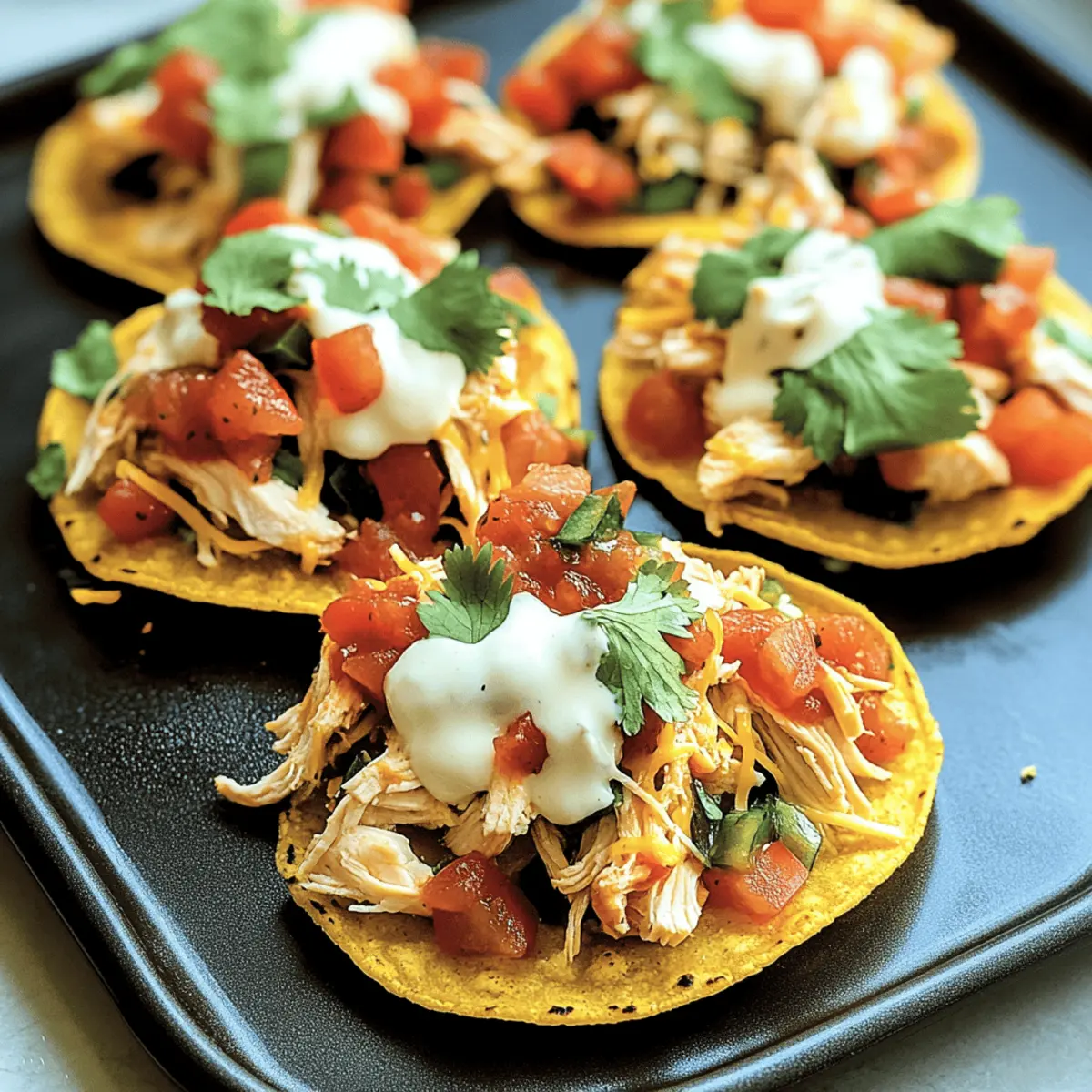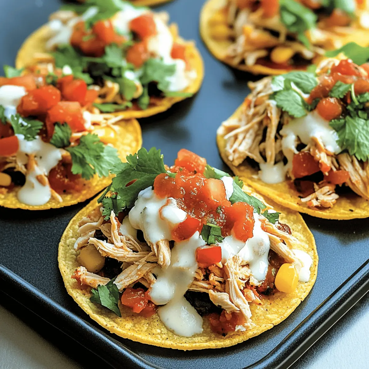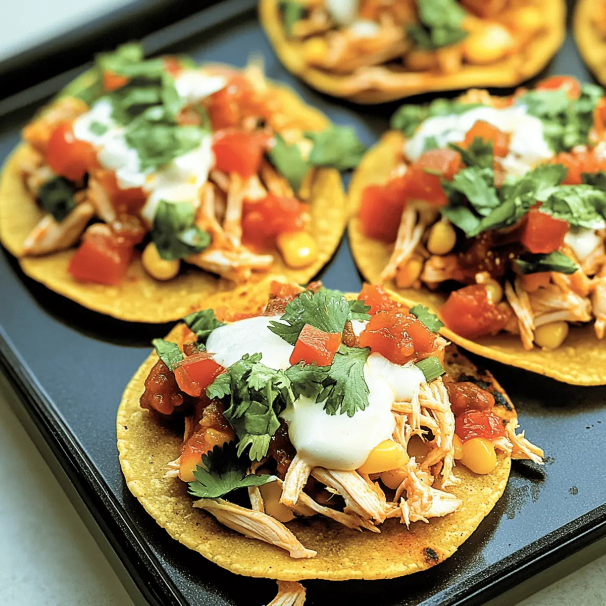 Great question! To prevent sogginess, ensure your tortillas are adequately crispy by baking them until golden brown. Layer your toppings carefully; place hearty ingredients like the chicken mixture first, followed by cheese and lighter toppings. Serving salsa on the side rather than directly on the tostadas can also help keep everything crispy.