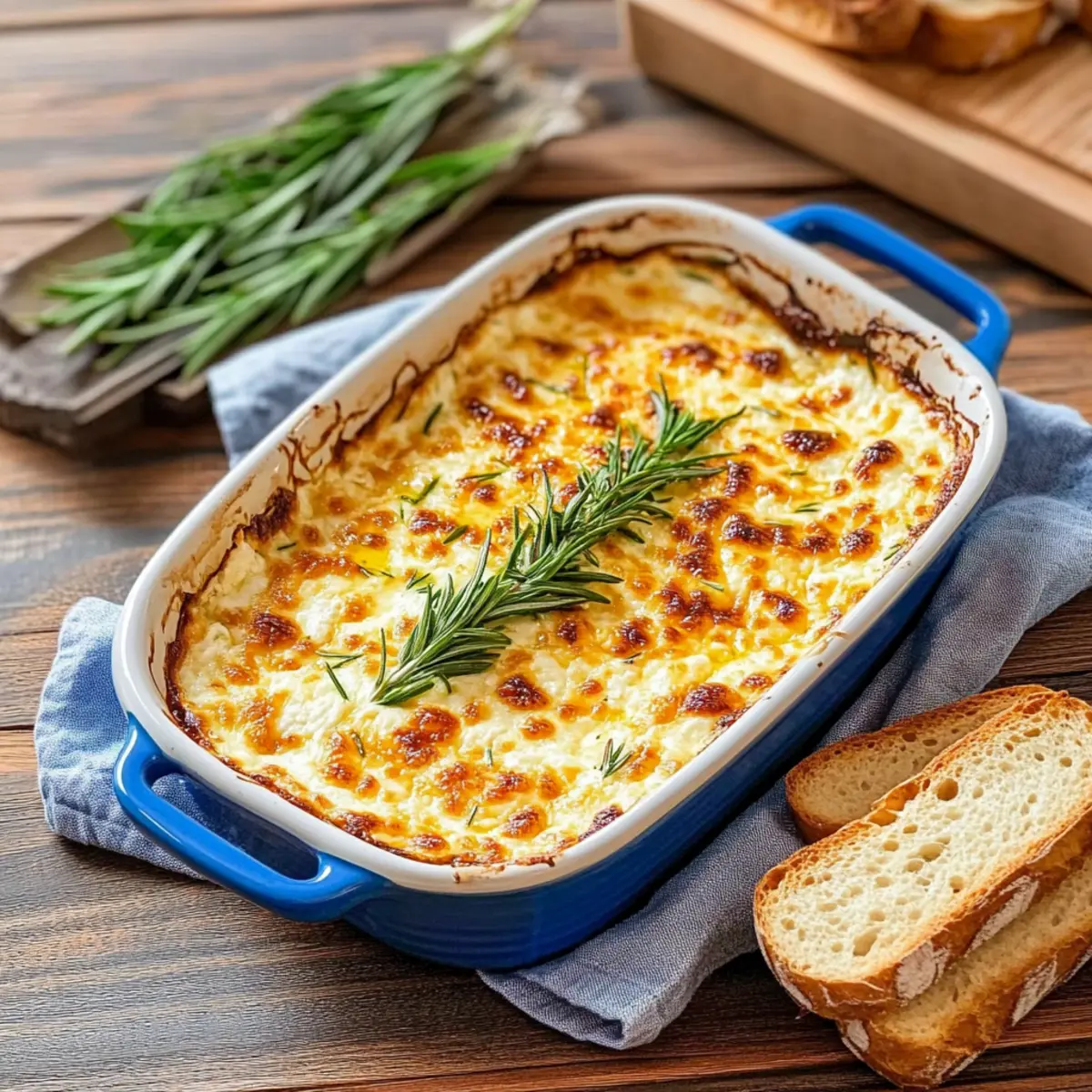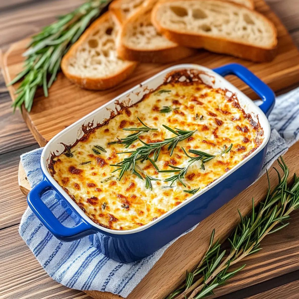 Once you’re satisfied with the golden color, remove the baking dish from the oven. Garnish the dip with the remaining fresh rosemary for a pop of color and added aroma. Allow it to cool slightly before serving your warm, cheesy dip with toasted baguette slices or your preferred dippers—enjoy the heartwarming flavors!