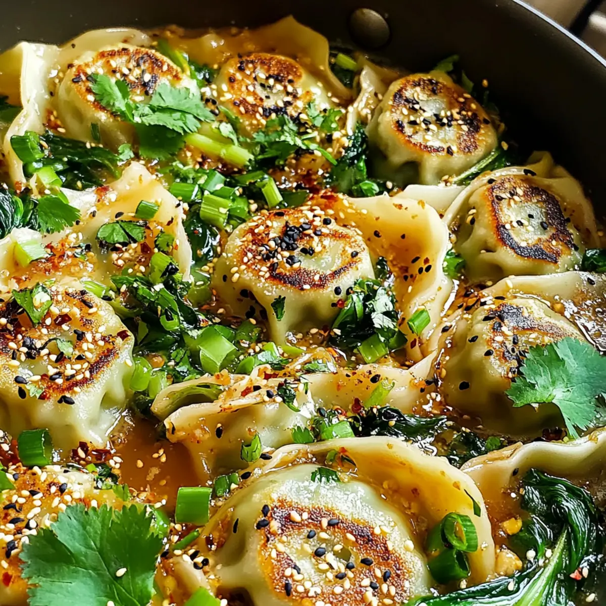 Once cooking time is complete, remove the skillet from heat. Garnish your One Pan Dumpling Dinner with chopped cilantro, sliced green onions, and a sprinkle of sesame seeds. For an extra kick, drizzle with chili oil if you like. Serve hot, and savor the beautiful blend of flavors and textures in each delightful bite.