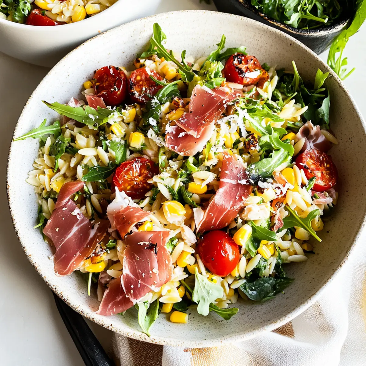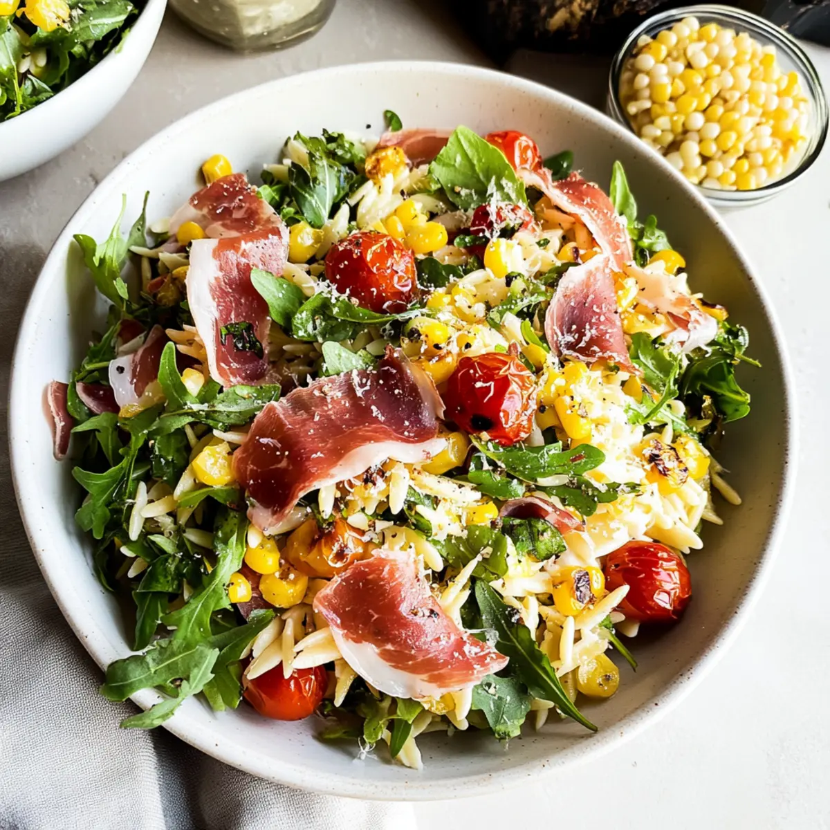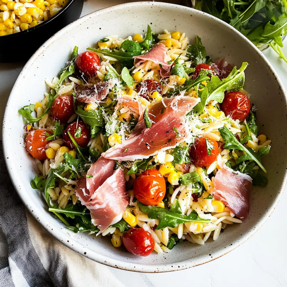 As I sat on my porch sipping lemonade, the aromas of summer started to drift from the kitchen. What better way to celebrate the season than with a Fresh Orzo Salad with Prosciutto di Parma and Garlicky Parmesan Vinaigrette? This salad isn’t just a dish; it encapsulates the essence of summer, bursting with charred corn, juicy cherry tomatoes, and peppery arugula. The Prosciutto di Parma adds a touch of luxury and depth, while the quick vinaigrette brings it all together in a delightful medley. Perfect for meal prep or a last-minute cookout side, this salad captures the vibrancy of seasonal ingredients and is a guaranteed crowd-pleaser. Whether you’re hosting friends or simply enjoying a quiet evening at home, you’ll find this dish refreshing and satisfying. Ready to whip up something that makes your taste buds dance? Let’s dive into the recipe!