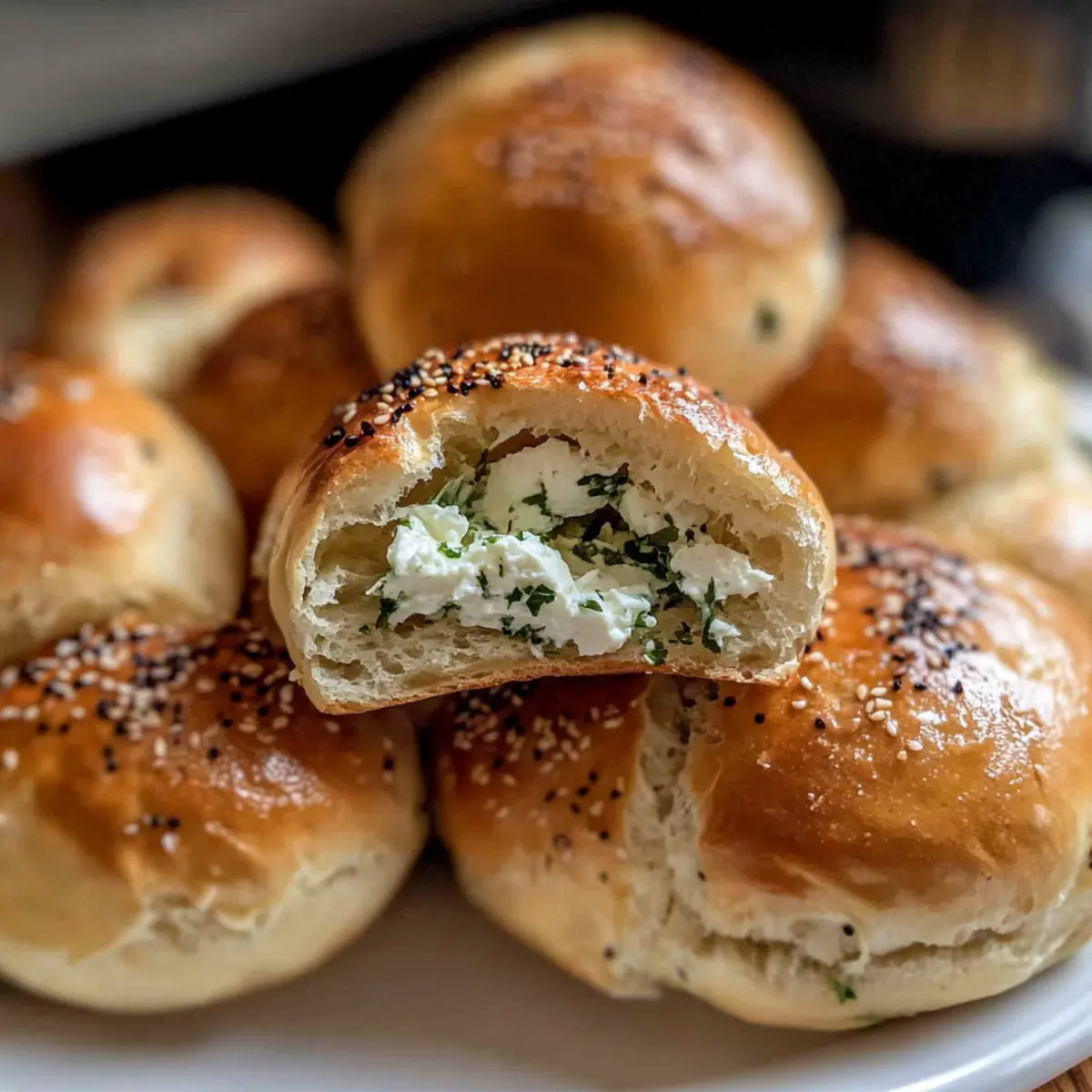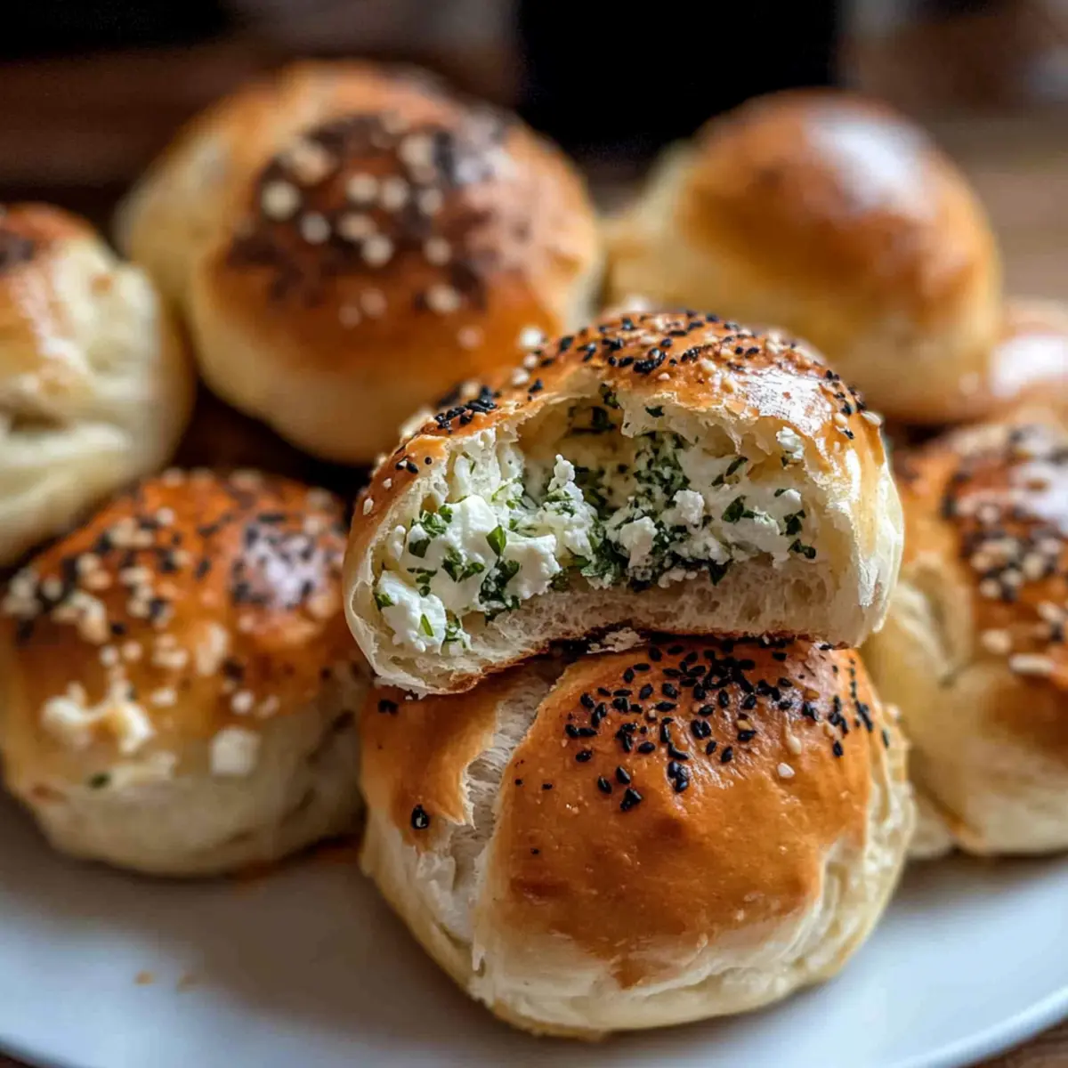 - Shape Buns: Punch down the dough, divide into 22 pieces, shape each into a ball, fill with feta mixture, and seal. Place on a lined baking tray.
