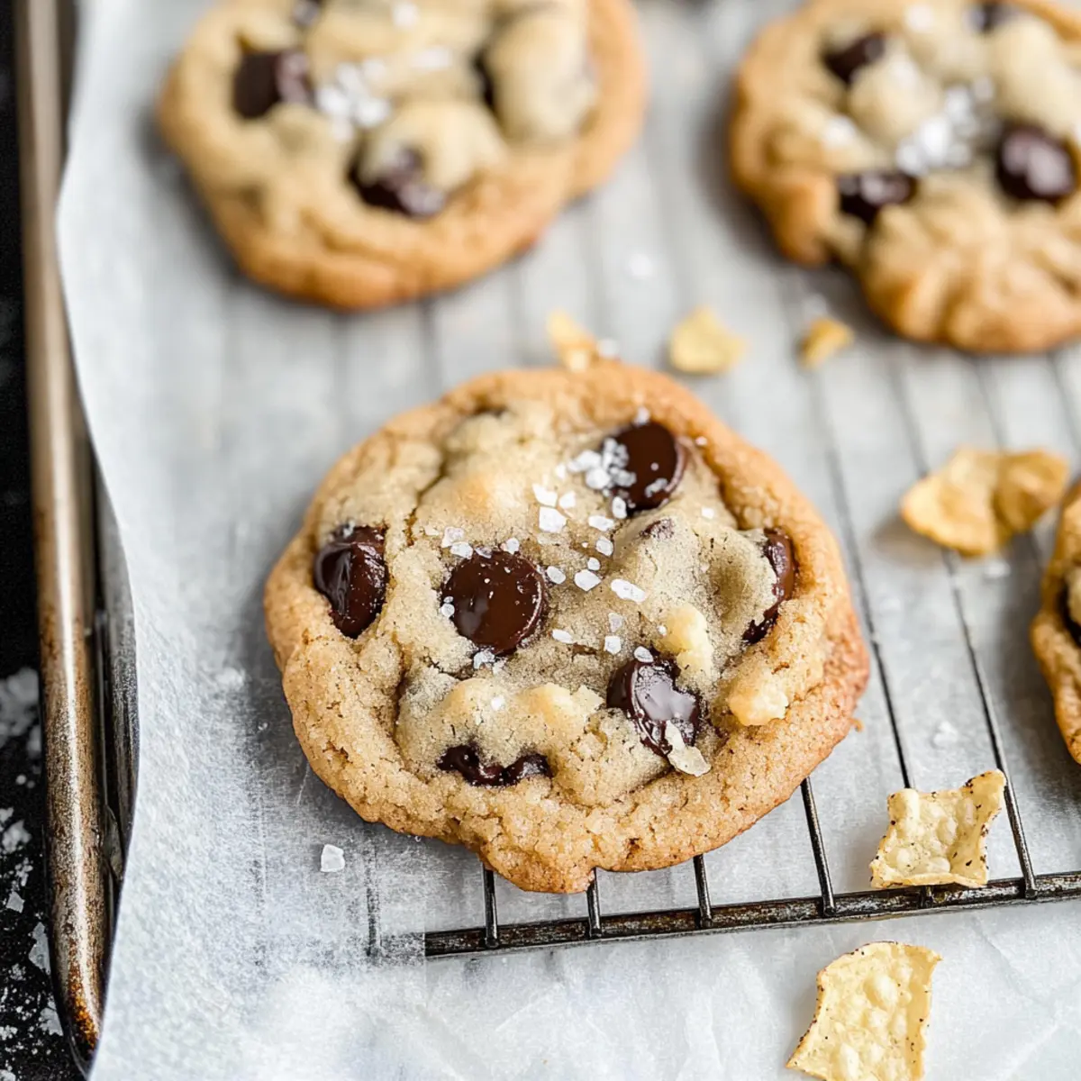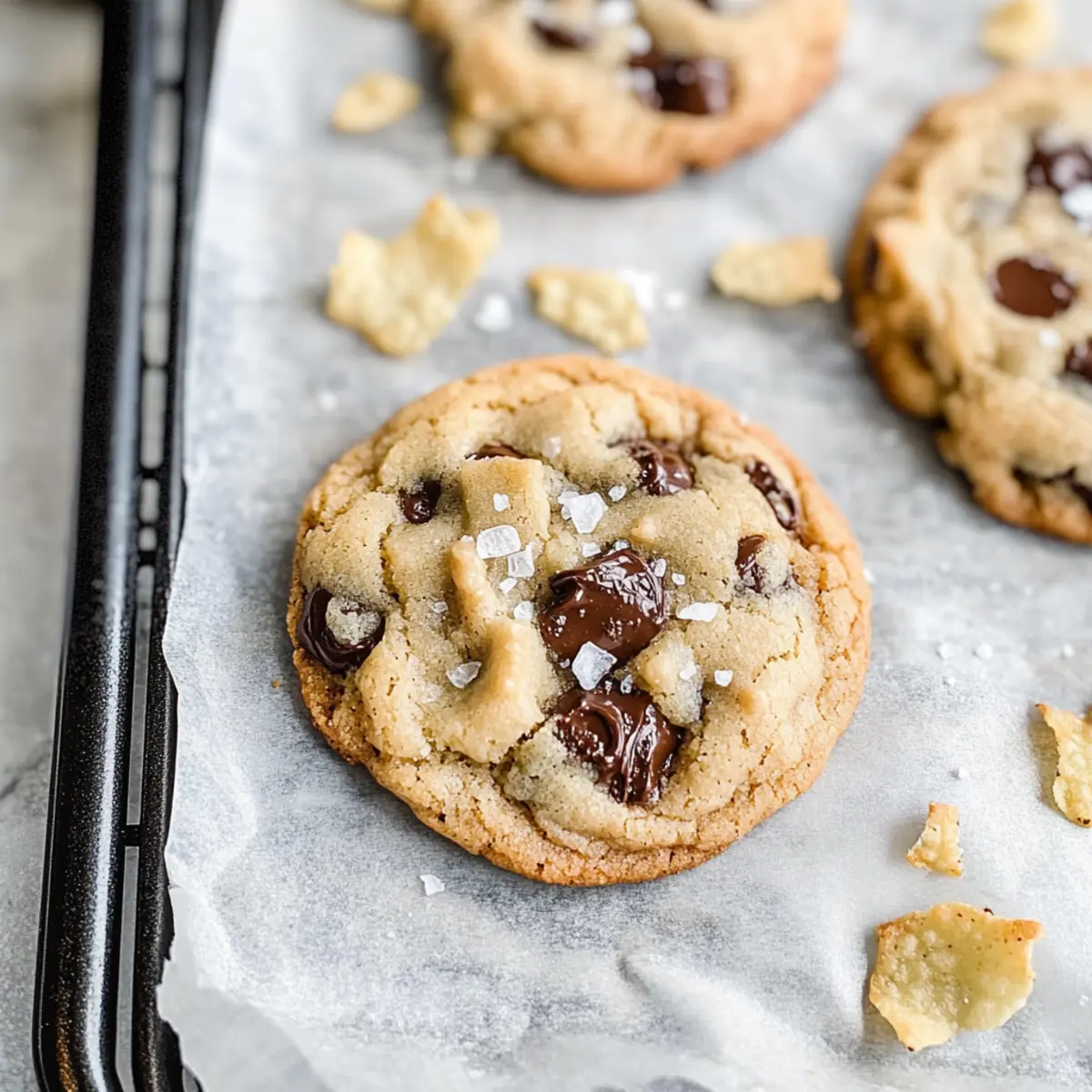Remove the baking sheet from the oven and sprinkle the warm cookies with a pinch of flaky sea salt for an extra burst of flavor. Allow the cookies to cool on the sheet for 5 minutes before transferring them to a wire rack to cool completely. This final step ensures the ideal texture while you savor your first bite of these delightful Potato Chip Chocolate Chip Cookies.