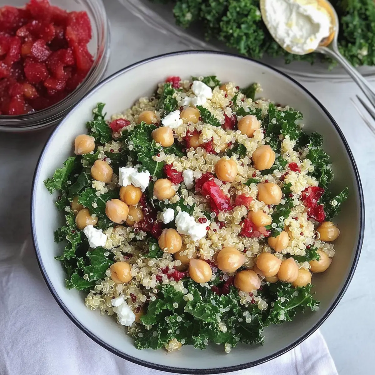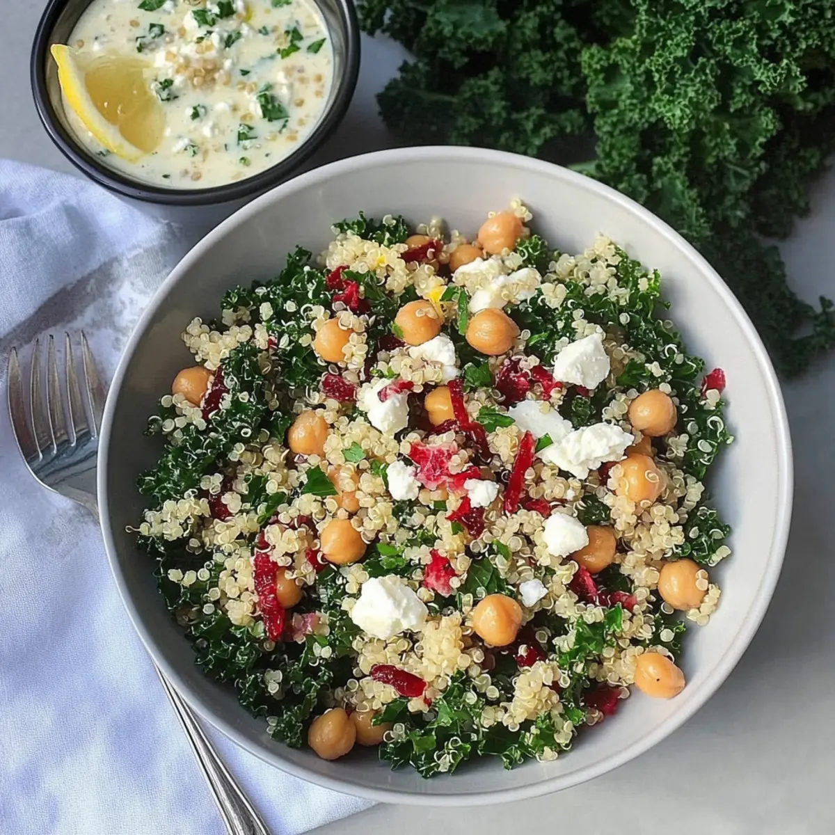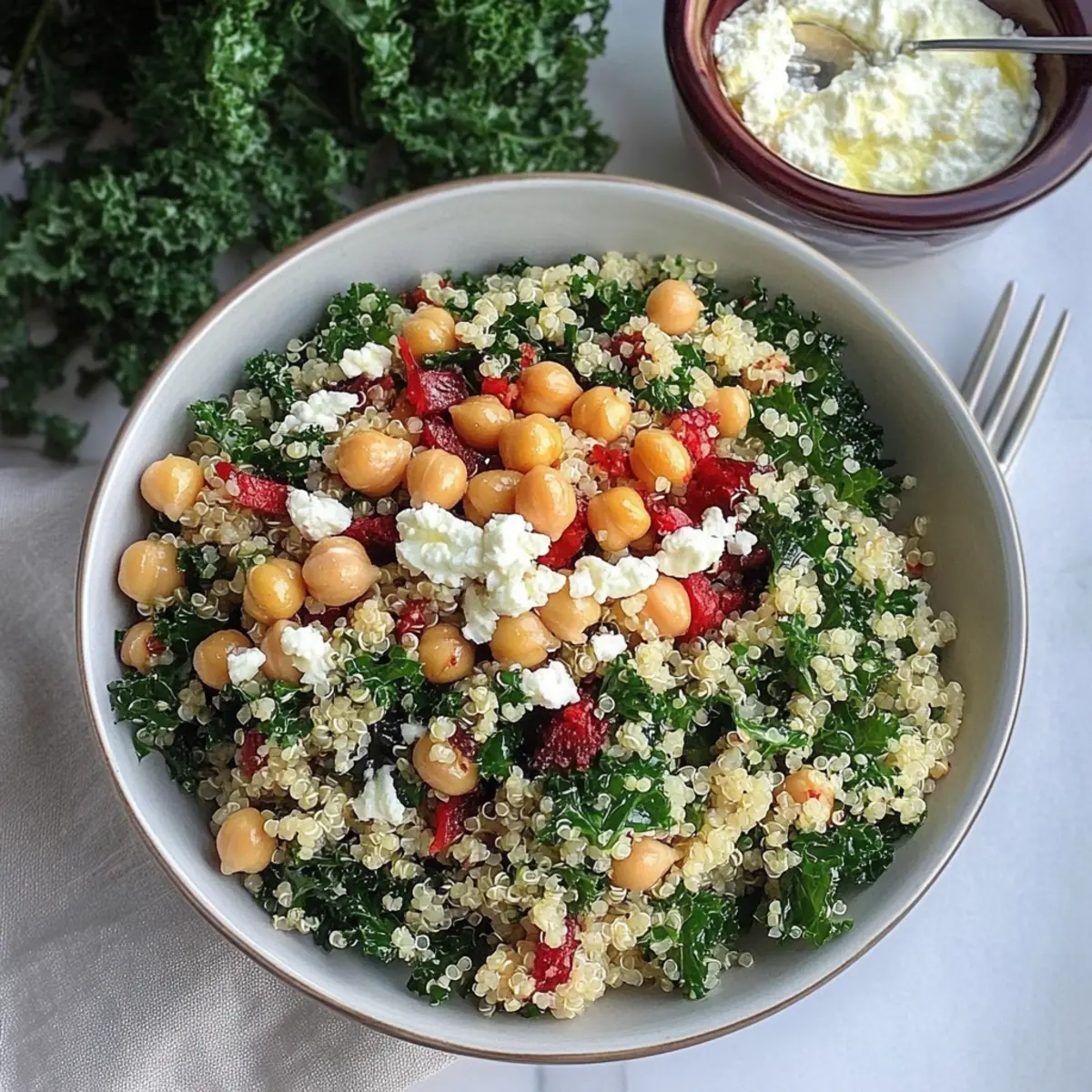 Vibrant, Flavorful Ingredients: This salad combines fresh kale, nutty quinoa, and crispy roasted chickpeas, creating a delightful mix of flavors.