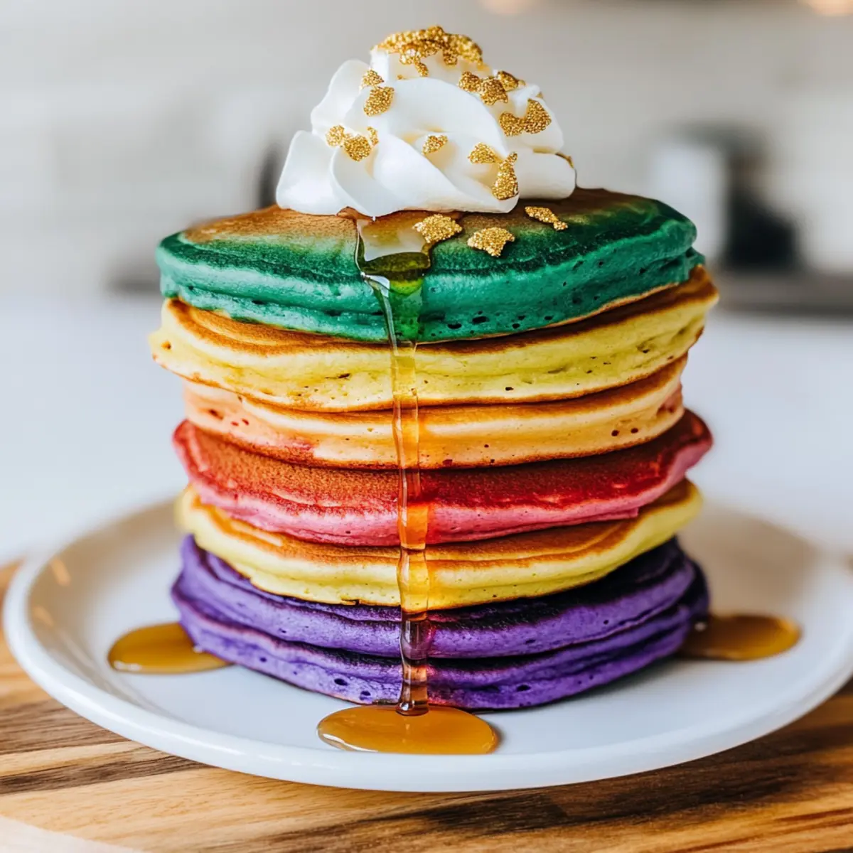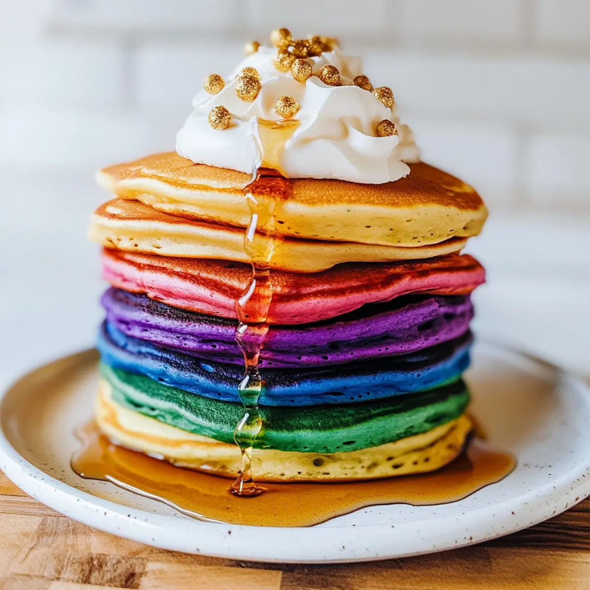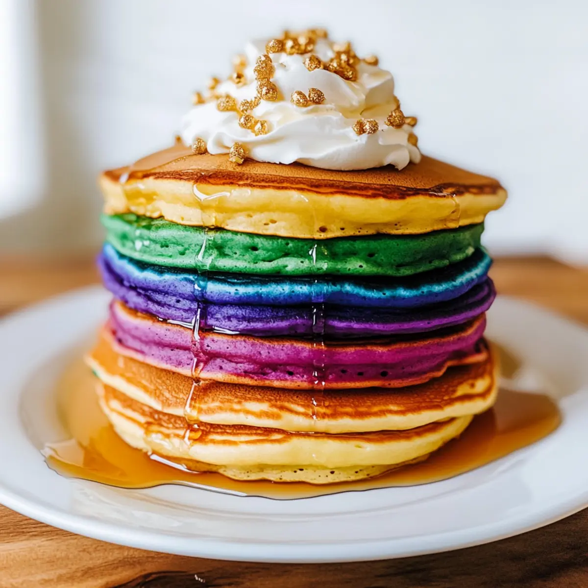- Stack the pancakes in rainbow order and serve with whipped cream and gold sprinkles.
