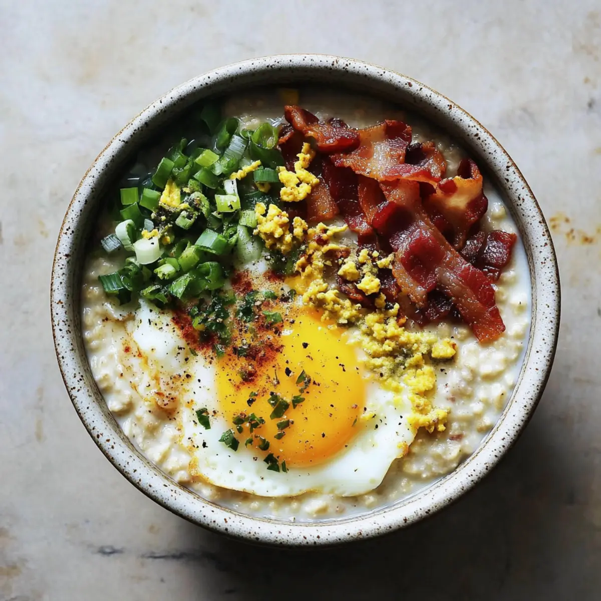 Spoon the cooked oatmeal into bowls, creating a cozy base. Top each bowl generously with the fried eggs, crumbled bacon, chopped green onions, and a sprinkle of crushed garlic. Finish with a dusting of za’atar and crushed red pepper for a punch of flavor that complements the savory oatmeal beautifully.